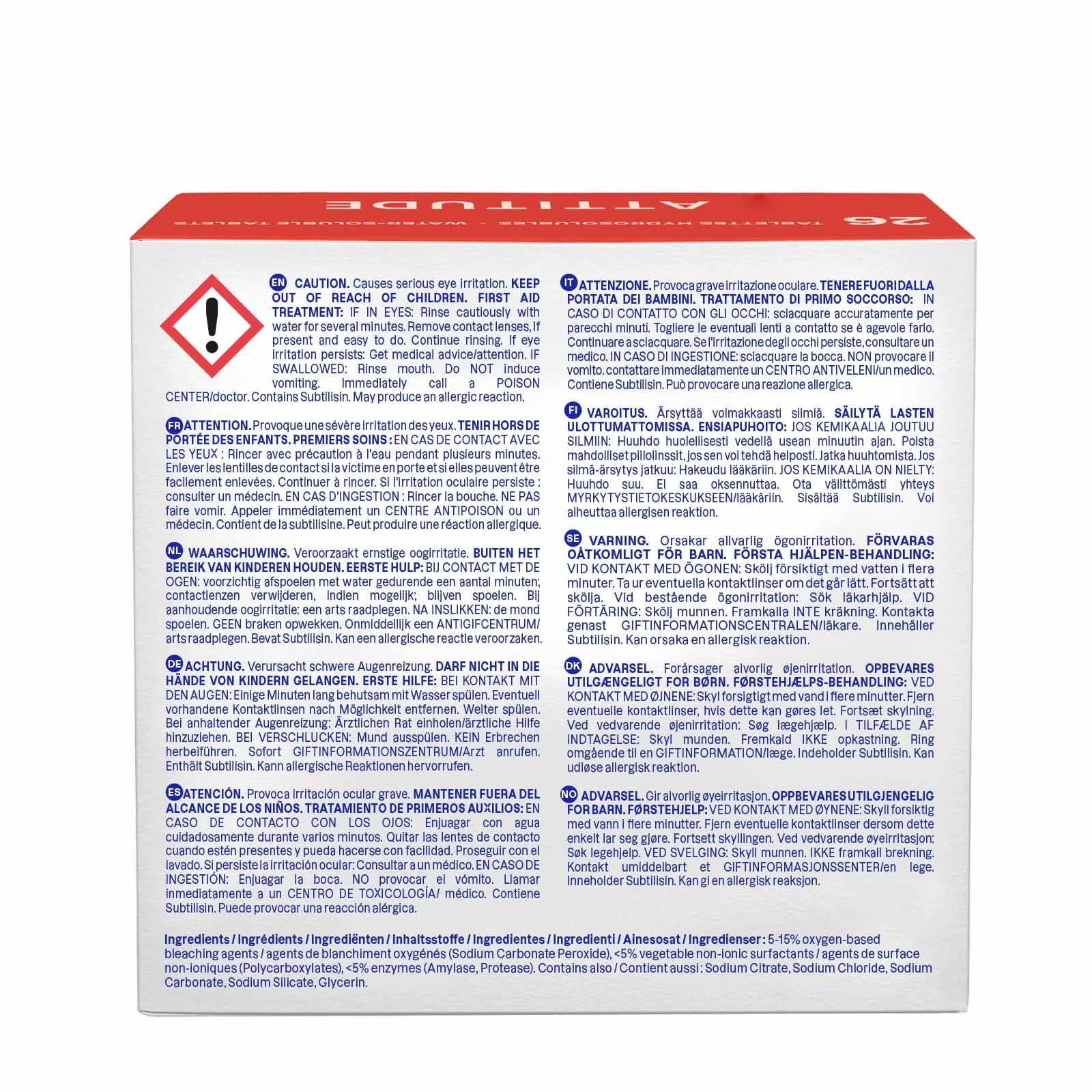 Bei Augenkontakt mindestens 15 Minuten mit Wasser spülen. Haut bei Kontakt gründlich mit Wasser reinigen. Die Tabs ausser Reichweite von Kindern aufbewahren.