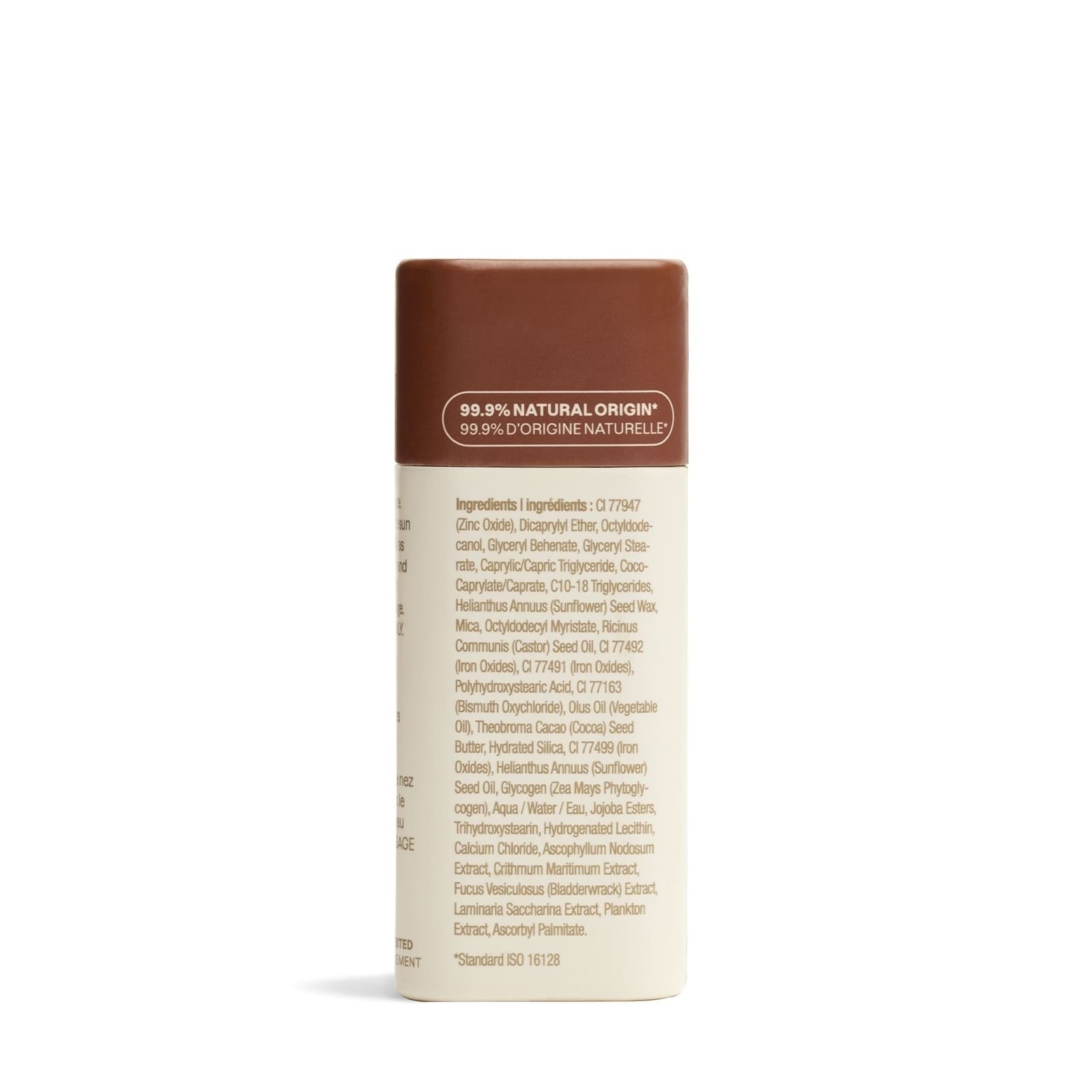 Inhaltsstoffe: CI 77947 (Zinkoxid), Dicaprylyl Ether, Octyldodecanol, Glyceryl Behenate, Glyceryl Stearate, Caprylic/Capric Triglyceride, Coco-Caprylate/Caprate, C10-18 Triglycerides, Helianthus Annuus (Sonnenblumen) Samenwachs, Glimmer, Octyldodecyl Myristate, Ricinus Communis (Rizinus) Samenöl, CI 77492 (Eisenoxide), CI 77491 (Eisenoxide), Polyhydroxystearic Acid, CI 77163 (Bismutoxychlorid), Olus Oil (Pflanzenöl), Theobroma Cacao (Kakao) Samenbutter, Hydrated Silica, CI 77499 (Eisenoxide), Helianthus Annuus (Sonnenblumen) Samenöl, Glykogen (Zea Mays Phytoglycogen), Wasser, Jojobaester, Trihydroxystearin, Hydrogenated Lecithin, Calcium Chloride, Tocopherol, Ascophyllum Nodosum Extrakt, Crithmum Maritimum Extrakt, Fucus Vesiculosus (Blasentang) Extrakt, Laminaria Saccharina Extrakt, Plankton Extrakt, Ascorbyl Palmitate