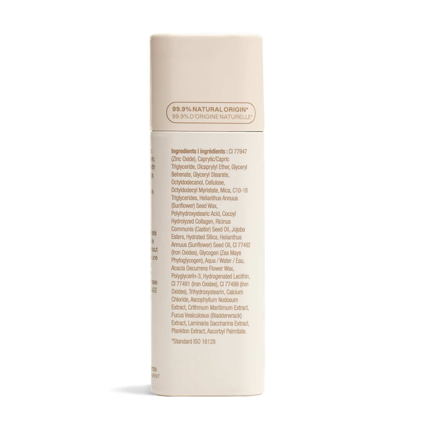 Inhaltsstoffe: Octyldodecanol, Caprylic/Capric Triglyceride, CI 77492 (Eisenoxide), Octyldodecyl Myristate, Theobroma Cacao (Kakao) Samenbutter, CI 77947 (Zinkoxid), CI 77491 (Eisenoxide), C10-18 Triglyceride, CI 77499 (Eisenoxide), Polyhydroxystearinsäure, Cellulose, Glyceryl Behenate, Glyceryl Stearate, Helianthus Annuus (Sonnenblumen) Samenwachs, Hydrated Silica, Cocoyl Hydrolyzed Collagen, Prunus Amygdalus Dulcis (Süssmandel) Öl, Ricinus Communis (Rizinus) Samenöl, Jojobaester, Helianthus Annuus (Sonnenblumen) Samenöl, Wasser, Trihydroxystearin, Glykogen (Zea Mays Phytoglycogen), Ascophyllum Nodosum Extrakt, Crithmum Maritimum Extrakt, Fucus Vesiculosus (Blasentang) Extrakt, Laminaria Saccharina Extrakt, Planktonextrakt, Ascorbyl Palmitate