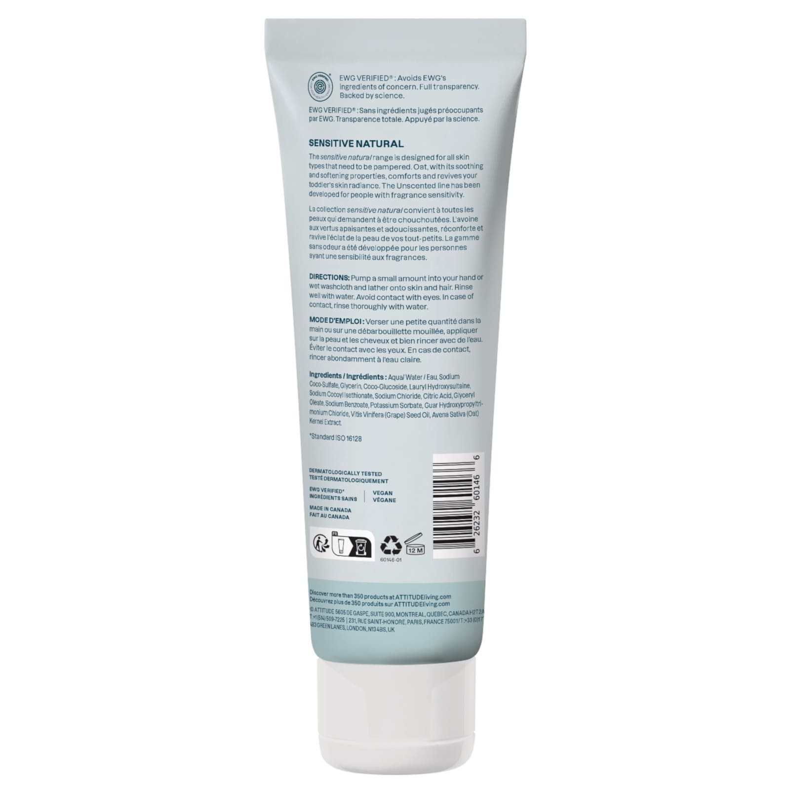 Das ATTITUDE sensitive natural 2in1 Shampoo & Duschgel ist ideal für die sanfte Reinigung der zarten Babyhaut. Es besteht zu 98 % aus Inhaltsstoffen natürlichen Ursprungs und ist mit Hafer-Extrakt angereichert, der für seine beruhigenden Eigenschaften bekannt ist und das Erscheinungsbild trockener Haut verbessert. Dank seiner sulfatfreien Formel trocknet die Gel-Creme-Textur weder die Haut noch die Kopfhaut deines Babys aus. Das EWG Verified, vegane und dermatologisch getestete 2in1 Produkt vereinfacht das Baden und sorgt für sanfte, wohltuende Momente. Inhaltsstoffe: Wasser, Natriumcocosulfat, Glycerin, Coco-Glucosid, Laurylhydroxysultain, Natriumcocoylisethionat, Natriumchlorid, Zitronensäure, Glyceryloleat, Natriumbenzoat, Kaliumsorbat, Guarhydroxypropyltrimoniumchlorid, Traubenkernöl, Haferkernextrakt