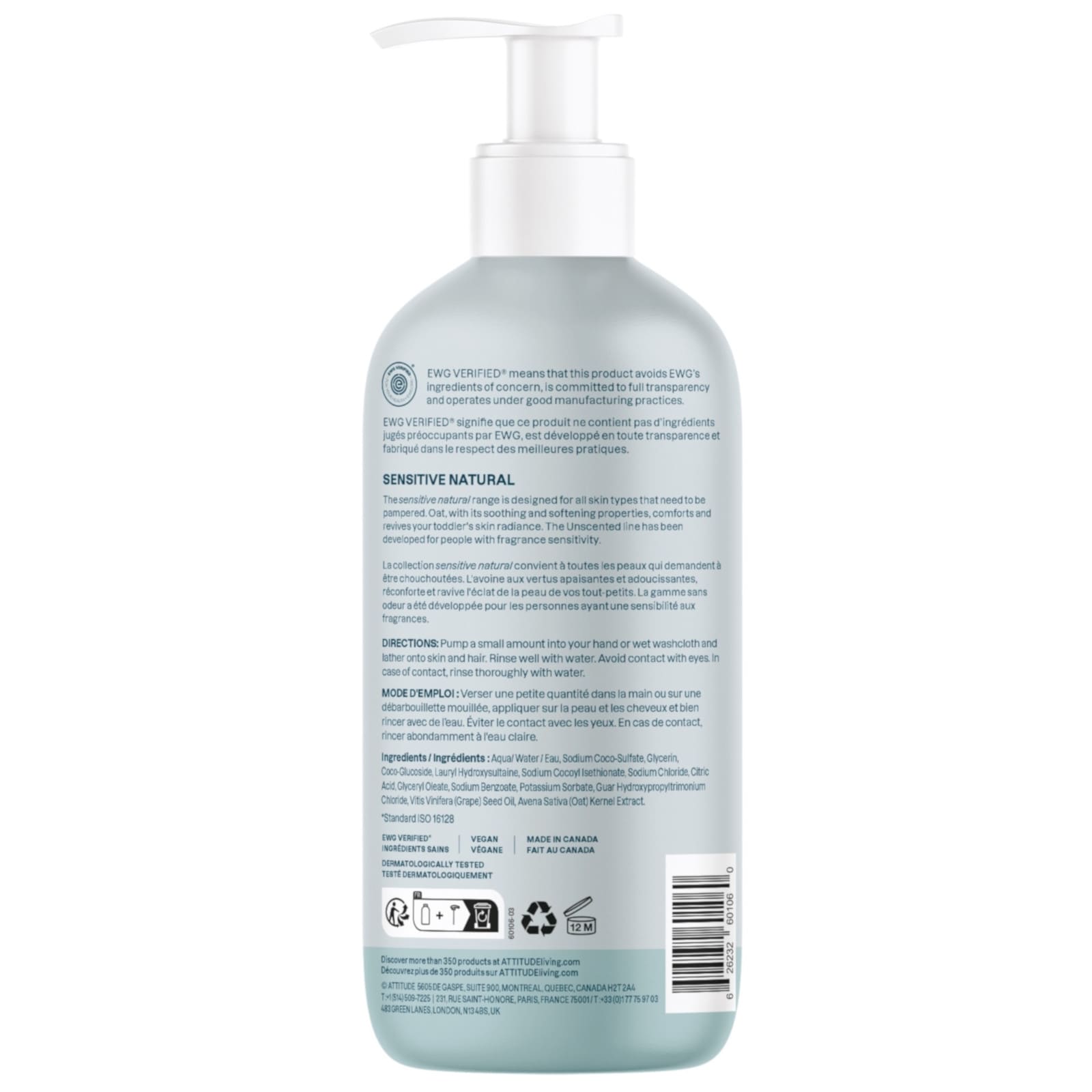 ATTITUDE sensitive natural 2in1 Shampoo & Body Wash ist ideal für die sanfte Reinigung der empfindlichen Haut deines Babys. Es besteht zu 98 % aus natürlichen Inhaltsstoffen und ist mit Hafer-Extrakt angereichert, der für seine beruhigenden Eigenschaften bekannt ist und das Erscheinungsbild trockener Haut verbessert. Dank seiner sulfatfreien Formel trocknet die Gel-Creme-Textur die Haut oder Kopfhaut deines Babys nicht aus. Ein EWG Verified®-zertifiziertes, veganes und dermatologisch getestetes 2in1 Produkt, das das Baden vereinfacht und gleichzeitig für sanfte, beruhigende Momente sorgt. Inhaltsstoffe: Wasser, Natriumcocosulfat, Glycerin, Kokosglucosid, Laurylhydroxysultain, Natriumcocoylisethionat, Natriumchlorid, Zitronensäure, Glyceryloleat, Natriumbenzoat, Kaliumsorbat, Guarhydroxypropyltrimoniumchlorid, Vitis Vinifera (Trauben) Samenöl, Avena Sativa (Hafer) Kernextrakt