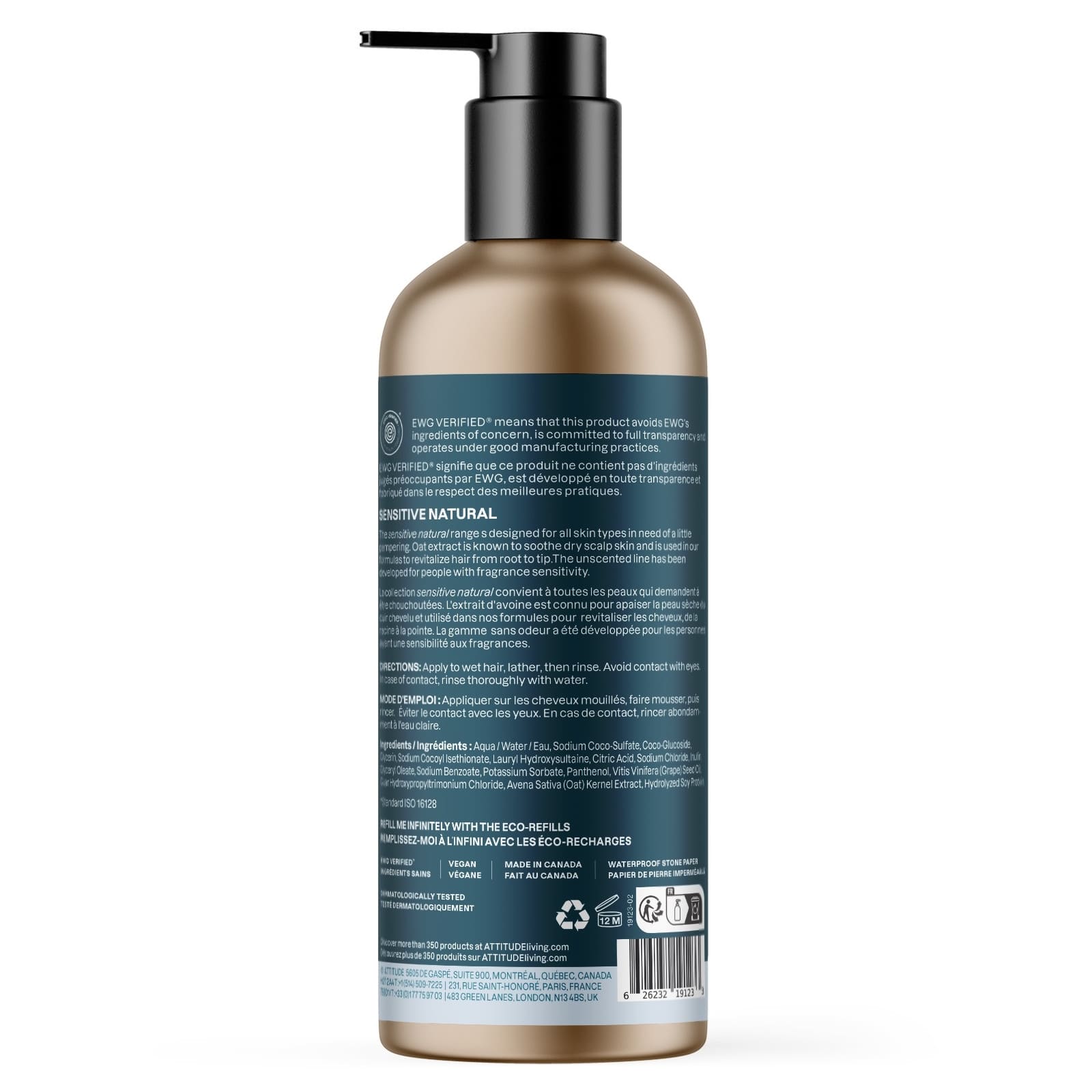 ATTITUDE Sensitive Natural Shampoo ultra-sanft und volumengebend, ideal für empfindliche Kopfhaut. Dieses parfümfreie Shampoo mit 97 % Inhaltsstoffen natürlichen Ursprungs ist mit Hafer-Extrakt angereichert, der für seine beruhigenden Eigenschaften und sein verbessertes Aussehen bekannt ist. Es enthält ausserdem Sojaprotein, das dem Haar Leichtigkeit und Volumen verleiht. Die elegante, minimalistische und wiederbefüllbare Aluminiumflasche passt in jedes Badezimmer. Die Formel ist EWG-geprüft, vegan und dermatologisch getestet, für ein sanftes und wohltuendes Duscherlebnis. Inhaltsstoffe: Wasser, Natriumcocosulfat, Coco-Glucosid, Glycerin, Natriumcocoylisethionat, Laurylhydroxysultain, Zitronensäure, Natriumchlorid, Inulin, Glyceryloleat, Natriumbenzoat, Kaliumsorbat, Panthenol, Traubenkernöl (Vitis Vinifera), Guarhydroxypropyltrimoniumchlorid, Haferkernextrakt (Avena Sativa), hydrolysiertes Sojaprotein