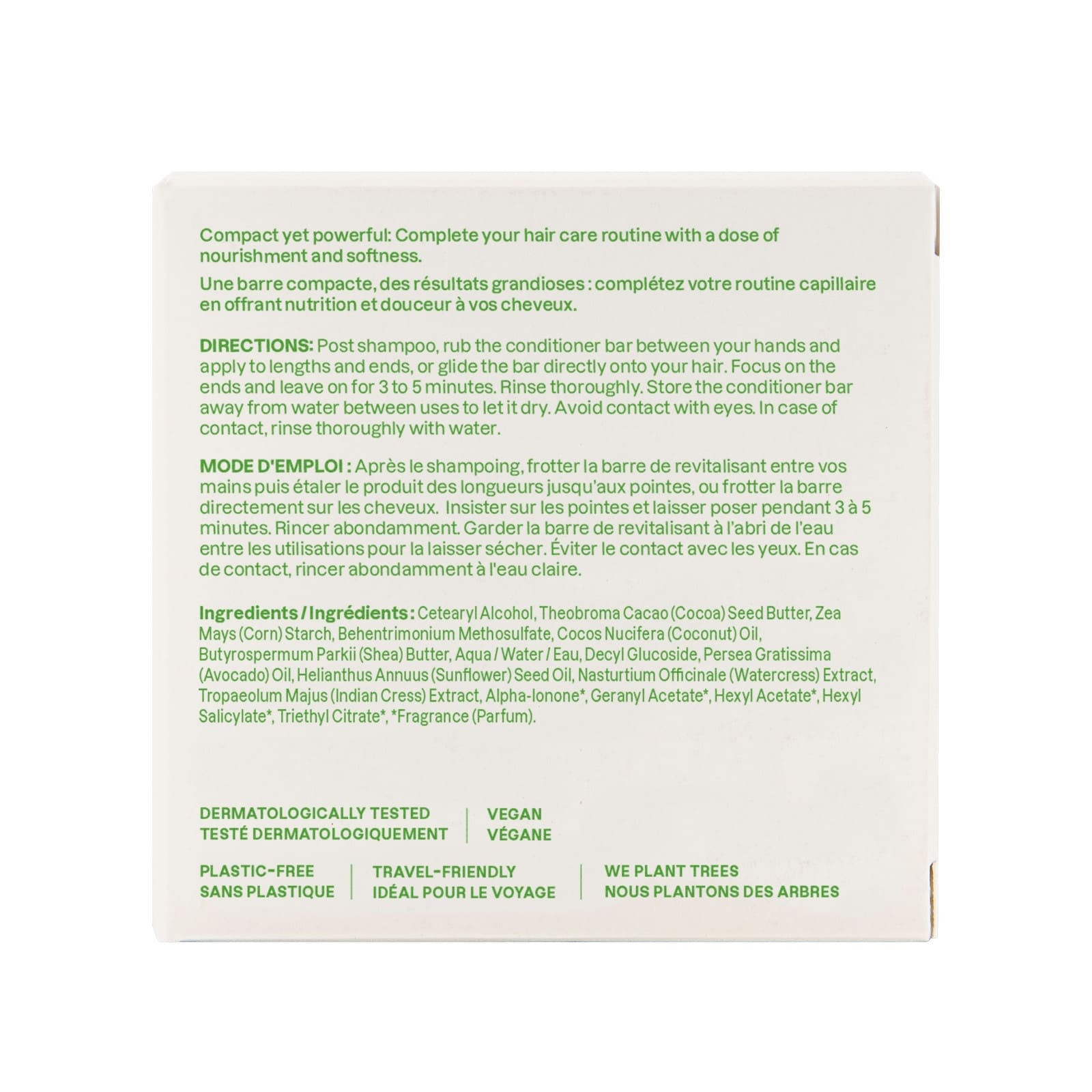 Der vegane und kunststofffreie Nourishing Conditioner Bar von ATTITTUDE besteht zu 96 % aus Inhaltsstoffen natürlichen Ursprungs und ist ideal für stumpfes Haar. Seine Formel enthält blaue Tonerde, die das Haar sanft reinigt und überschüssiges Öl und Talg absorbiert, sowie Avocadoöl, das die Feuchtigkeit des Haares bewahrt. Diese Pflegespülung ist dermatologisch getestet und hinterlässt dank seines cremigen Schaums mit dezentem Birnen- und Amberduft ein frisches Gefühl auf deinem Haar. Es ist in fester Form erhältlich und eignet sich perfekt für unterwegs oder für deine tägliche Routine. Gib deinem Haar die Pflege, die es verdient, ohne Kompromisse bei der Leistung oder der Umwelt einzugehen, indem du deine Routine mit dem pflegenden Shampoo-Bar beginnst. Inhaltsstoffe: Cetearylalkohol, Theobroma Cacao (Kakao) Samenbutter, Zea Mays (Mais) Stärke, Behentrimonium Methosulfate, Cocos Nucifera (Kokosnuss) Öl, Butyrospermum Parkii (Shea) Butter, Wasser, Decyl Glucoside, Persea Gratissima (Avocado) Öl, Helianthus Annuus (Sonnenblumen) Samenöl, Nasturtium Officinale (Brunnenkresse) Extrakt, Tropaeolum Majus (Indische Kresse) Extrakt, Alpha-Ionone, Geranylacetat, Hexylacetat, Hexylsalicylat, Triethylcitrat