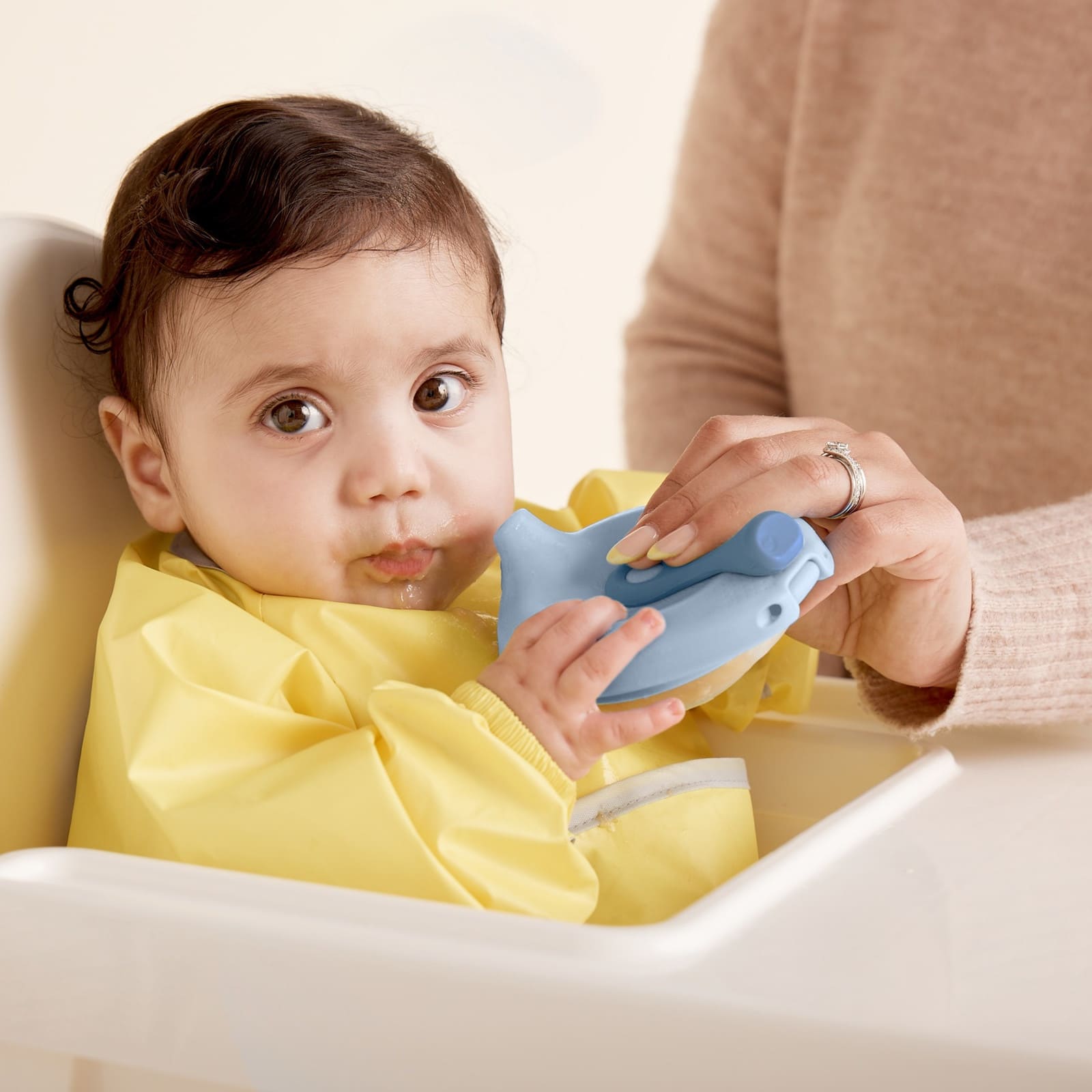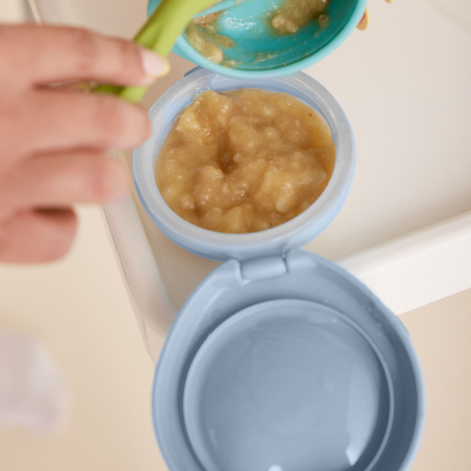 Der Fill & Feed Beutel fasst 110 ml und eignet sich für Pürees, Joghurt, Pudding und leichte Snacks. Dank wiederverschliessbarer Öffnung kannst du frisch zubereitete Kost sicher transportieren und mehrfach verwenden.