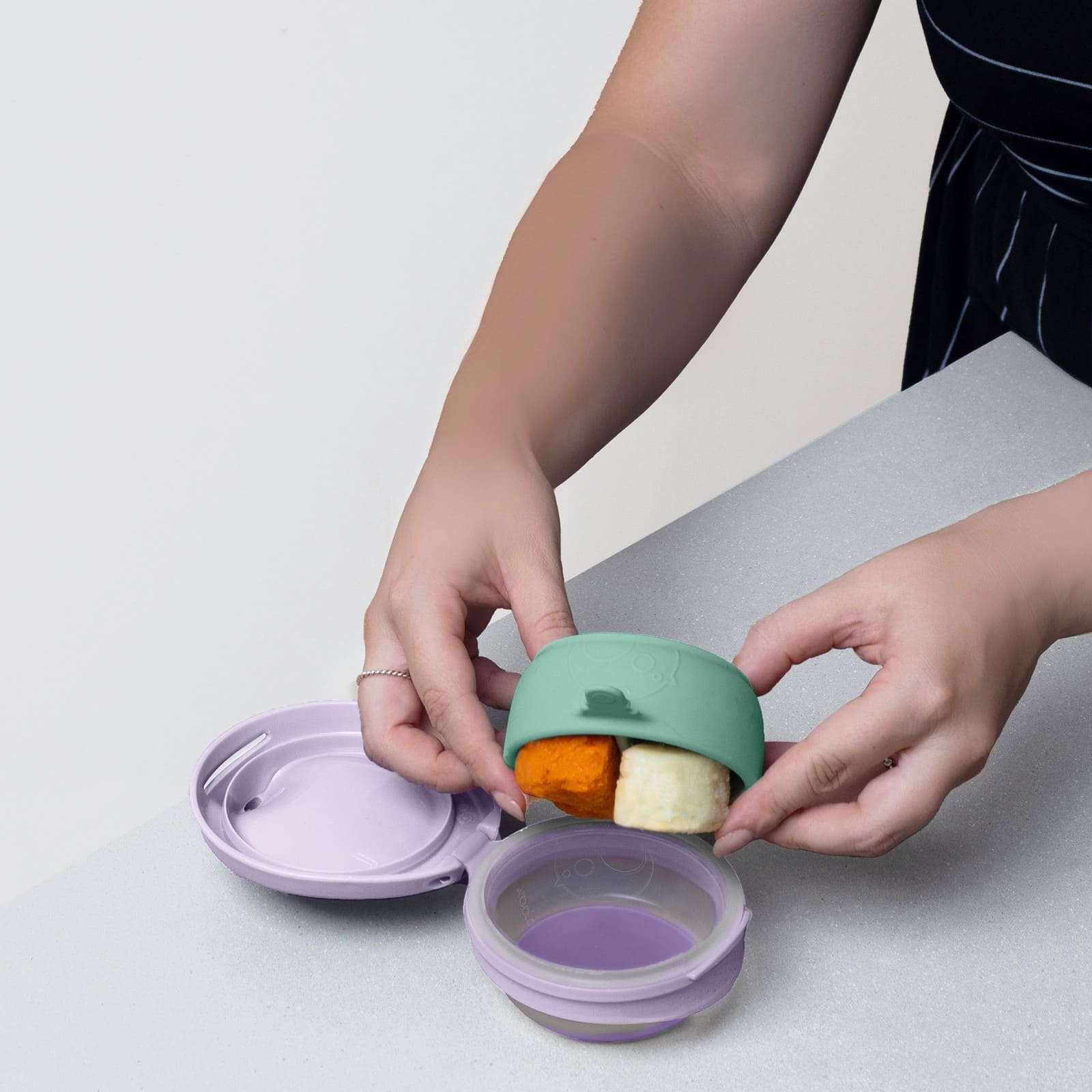 Die kontrastreiche Schutzkappe hält die Spitze hygienisch sauber und macht den Essensbeutel zu einem praktischen Begleiter bei Ausflügen, im Kinderwagen oder für den Kita-Tag.