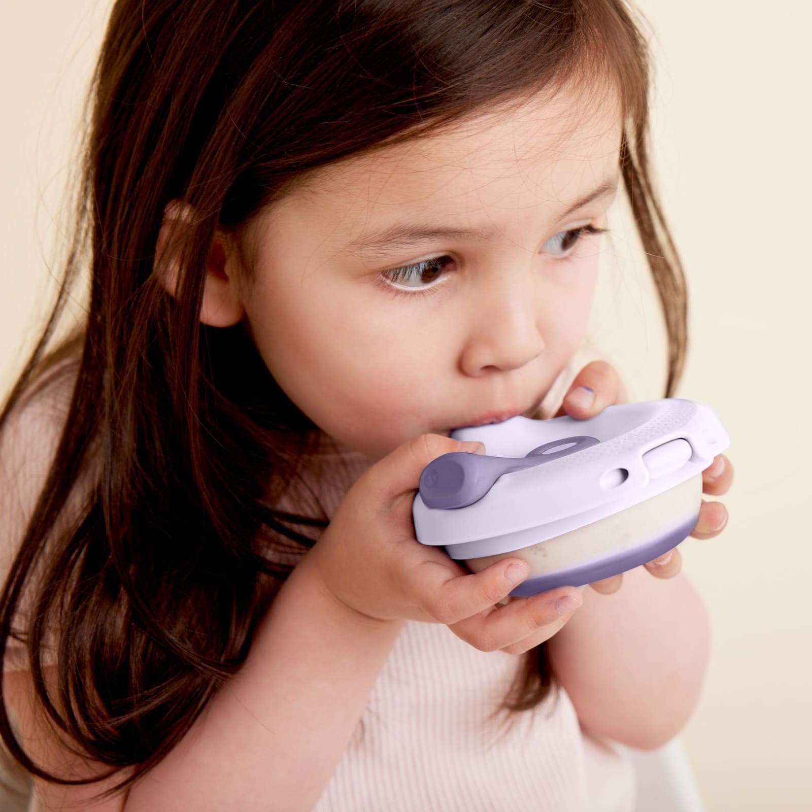 Die ergonomische Form und die angewinkelte Schnabelspitze ermöglichen Babys ein natürliches Saugen und fördern die Selbstständigkeit beim Essen. Der sichere Drehverschluss schliesst auslaufsicher, sodass du ihn bedenkenlos in der Tasche transportieren kannst.