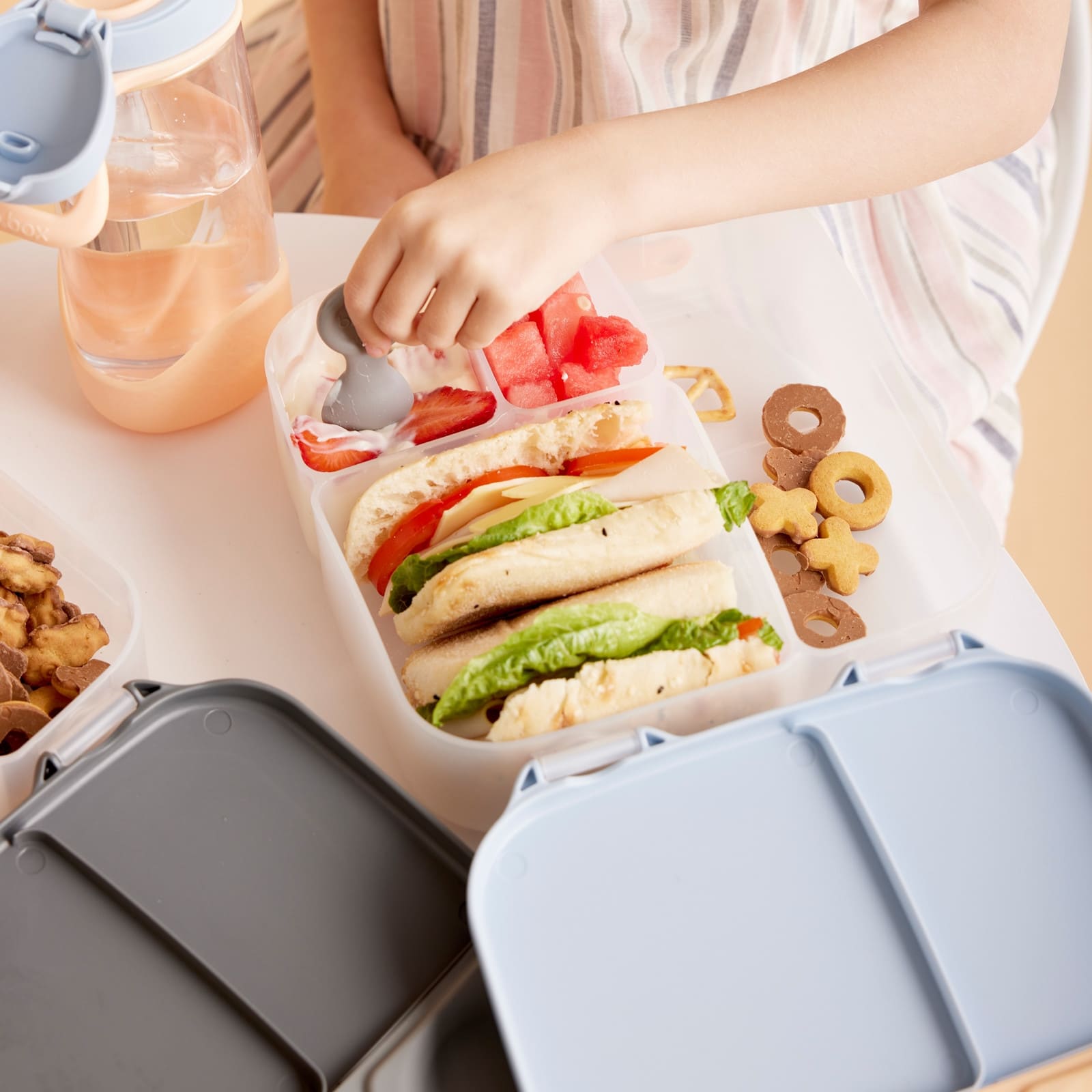 Die B.BOX Lunchbox 2L Feeling Peachy ist eine durchdachte Brotdose für den Alltag von Kindern. Mit 2 Litern Fassungsvermögen bietet sie Platz für Sandwiches, Snacks und frisches Obst, ohne dass die einzelnen Komponenten sich vermischen.