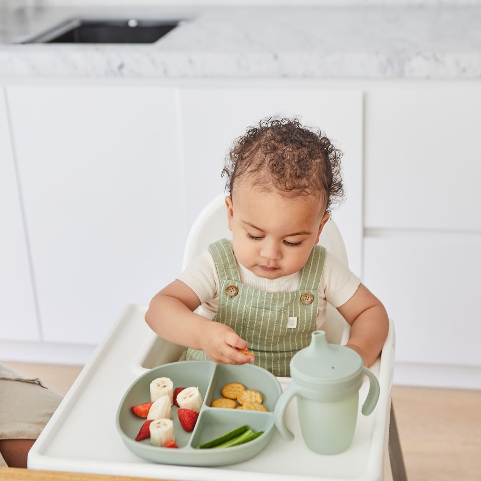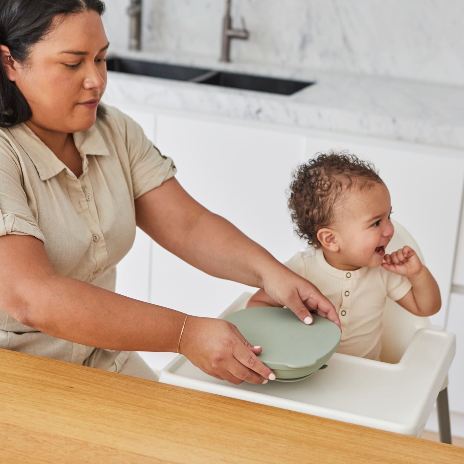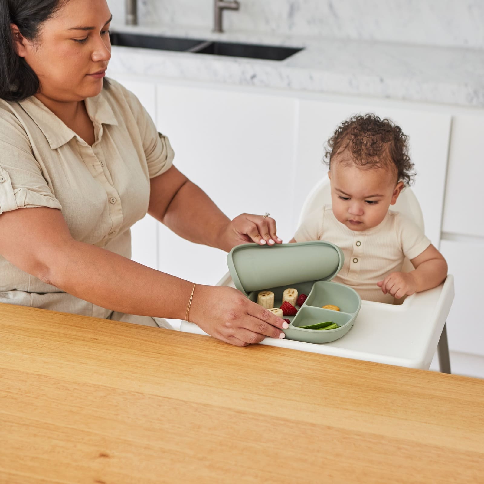 Ob zuhause oder unterwegs, der Teller überzeugt mit praktischem Deckel, stapelbarem Design und kompakten Abmessungen, die in viele Hochstühle und Taschen passen. Die dezente Farbe Sage fügt sich harmonisch in jede Küche ein.