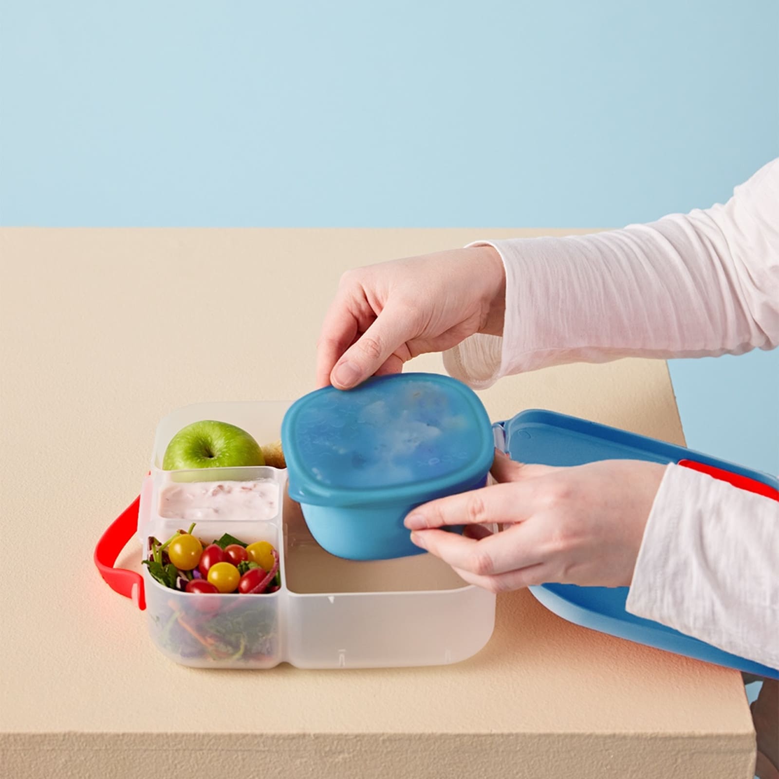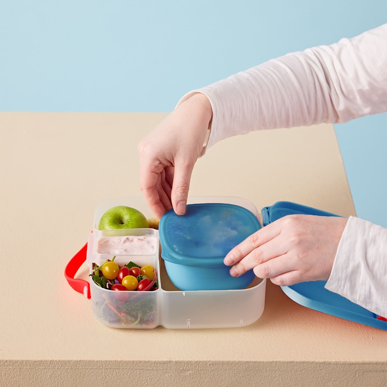 Die flexible Silikon-Ecklasche erleichtert das Öffnen und schliessen, sodass Kinder selbständig an ihren Znüni gelangen können. Das fördert Selbstständigkeit und macht die Box zu einem praktischen Begleiter für Schule, Kindergarten und Ausflüge.