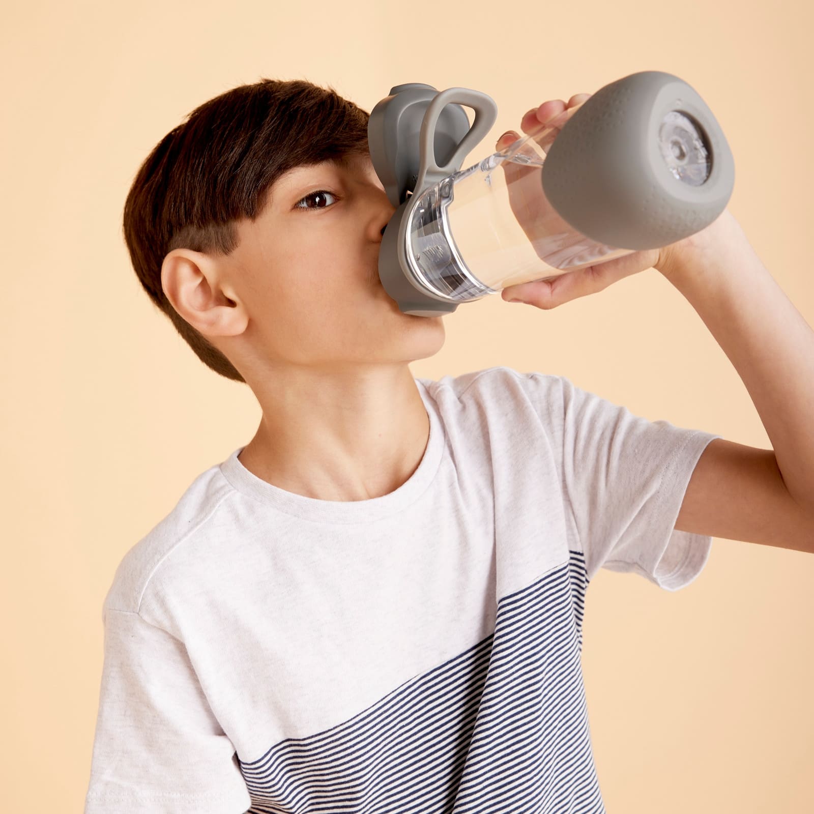 Der weiche Silikon-Sportschnabel sorgt für einen angenehmen Trinkfluss, der auf Kinder abgestimmt ist, und lässt sich leicht per Druckknopf öffnen und schliessen. Im geschlossenen Zustand ist die Flasche zuverlässig auslaufsicher, sodass sie bedenkenlos im Rucksack transportiert werden kann.