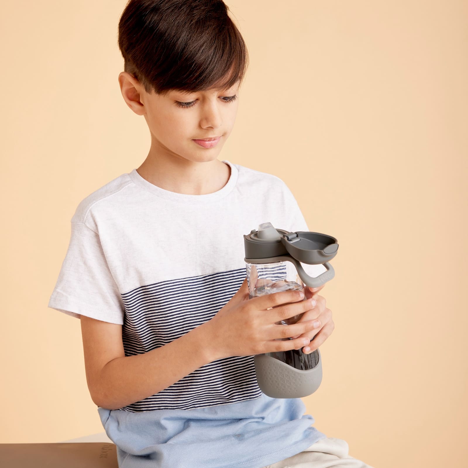 Gefertigt aus bruchsicherem Tritan bietet die Flasche hohe Langlebigkeit und Alltagstauglichkeit. Ein stossfester Rand an der Unterseite sowie ein flexibler Tragegriff schützen die Flasche bei Stürzen und vereinfachen das Mitnehmen.