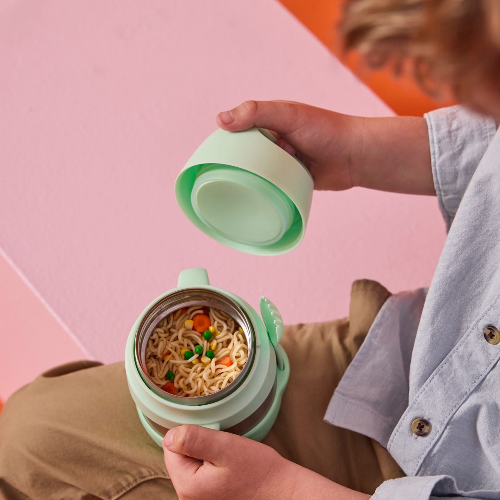 Der 335ml grosse Wärmebehälter für Speisen hält Essen den ganzen Tag über auf der perfekten Temperatur warm. Hergestellt aus hochwertigem doppelwandigem Edelstahl, hält dieses Kraftpaket warme Speisen bis zu 5 Stunden warm oder kalte Speisen bis zu 7 Stunden gekühlt. Er ist für Pasta, Suppen, Salate, Obst, Joghurt und mehr geeignet. Der speziell für Kinder im Vorschulalter entwickelte Thermosbecher für Essen hat Griffe, die die Kinder leicht selbst greifen und öffnen können. Mit der einzigartigen Stoppfunktion können Eltern den Deckel nicht zu fest anziehen. Der enthaltene Göffel kann in der Halterung verstaut werden, damit ist dein Kind immer bereit für Mahlzeiten in der Schule oder unterwegs. Er ist spülmaschinenfest (nur oberes Gestell). Durch die grosse Öffnung ist die Reinigung ein Kinderspiel, da es keine versteckten Spalten gibt, in denen sich Nahrung verstecken könnte. Der Warmhaltebehälter für Essen ist leicht und vollständig zerlegbar, für eine hygienischere Reinigung. Entferne einfach die Griffe und die Schutzkappe für einen altersgerechten Thermos Essensbehälter. Dank seines grossen Fassungsvermögens wird er gerne von älteren Kindern, Jugendlichen und Erwachsenen verwendet.