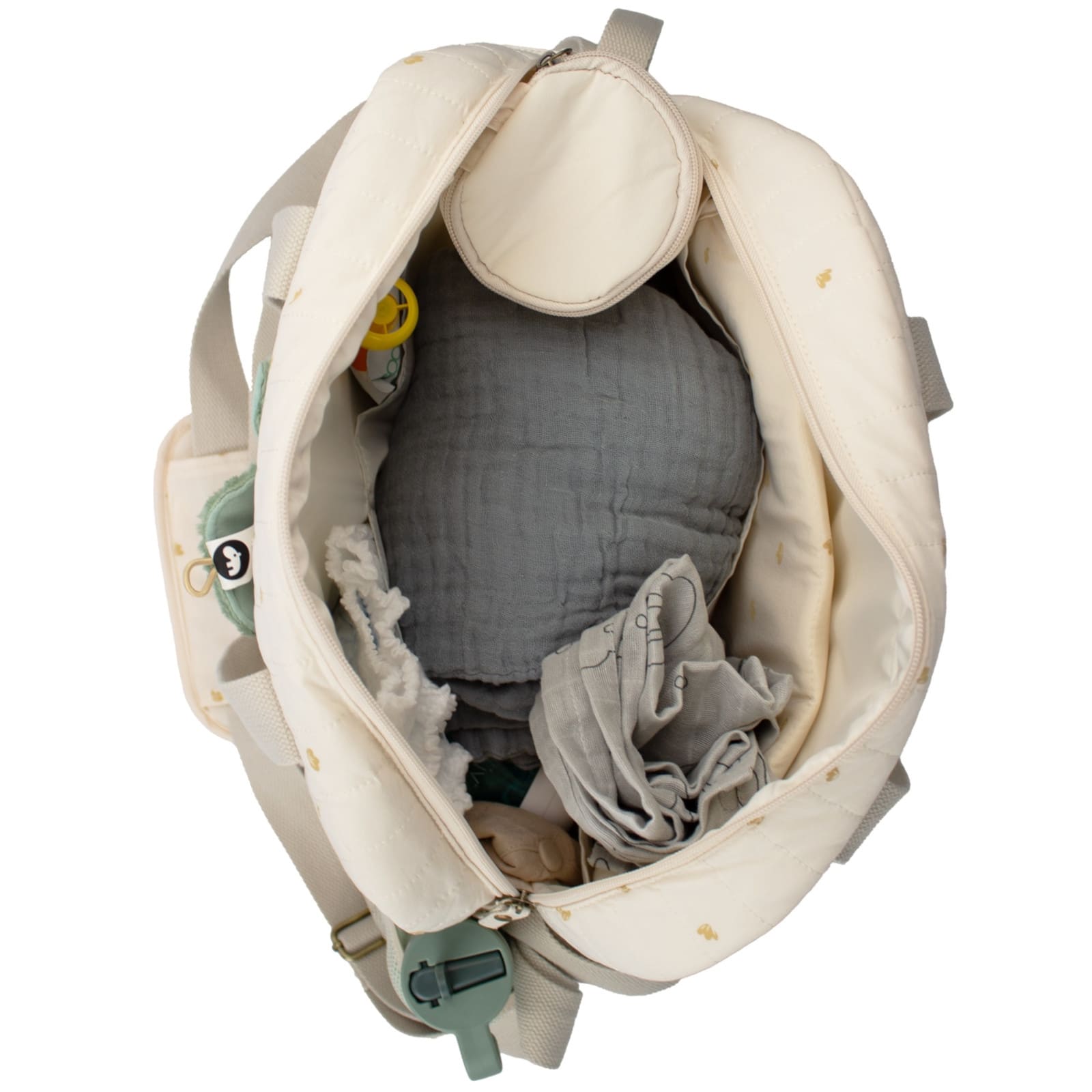 Die funktionale Tasche mit mehreren Fächern und praktischem Zubehör ist der ideale Begleiter für Eltern unterwegs. Ihr ergonomisches Design, die sicheren Verschlüsse und der optimierte Tragekomfort machen sie besonders benutzerfreundlich. Das Hauptfach mit grosser Öffnung und drei Innentaschen sowie vier zusätzlichen Aussentaschen auf der Vorderseite bieten reichlich Stauraum und eine perfekte Organisation. Zum Zubehör gehören eine isolierte Snacktasche, eine phthalatfreie Wickelauflage sowie ein verstellbarer Schultergurt mit Polsterung. Zwei robuste Griffe und Kinderwagen-Clips sorgen für zusätzlichen Komfort und Flexibilität im Alltag.