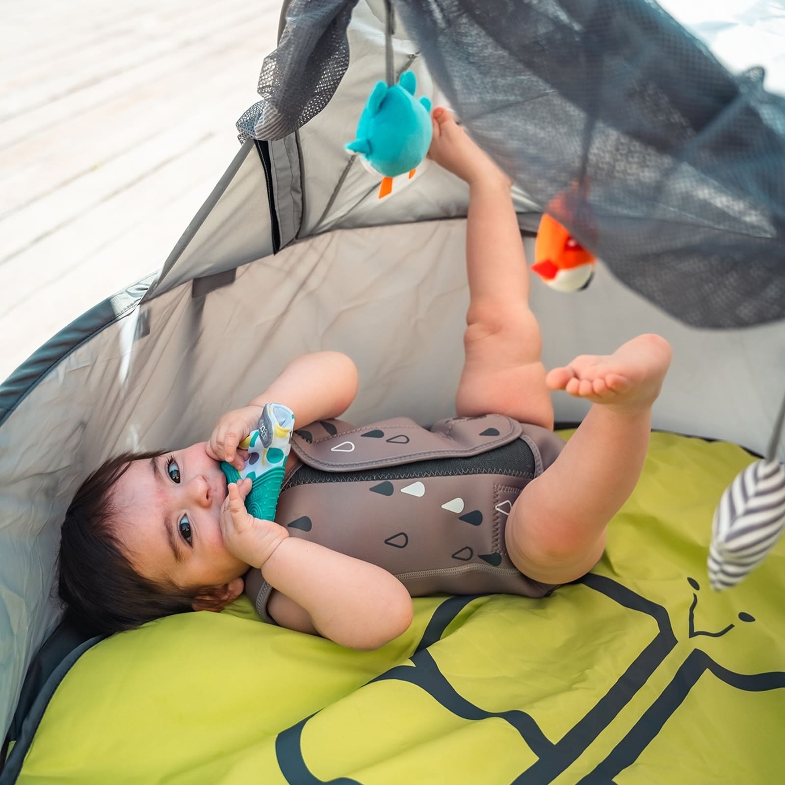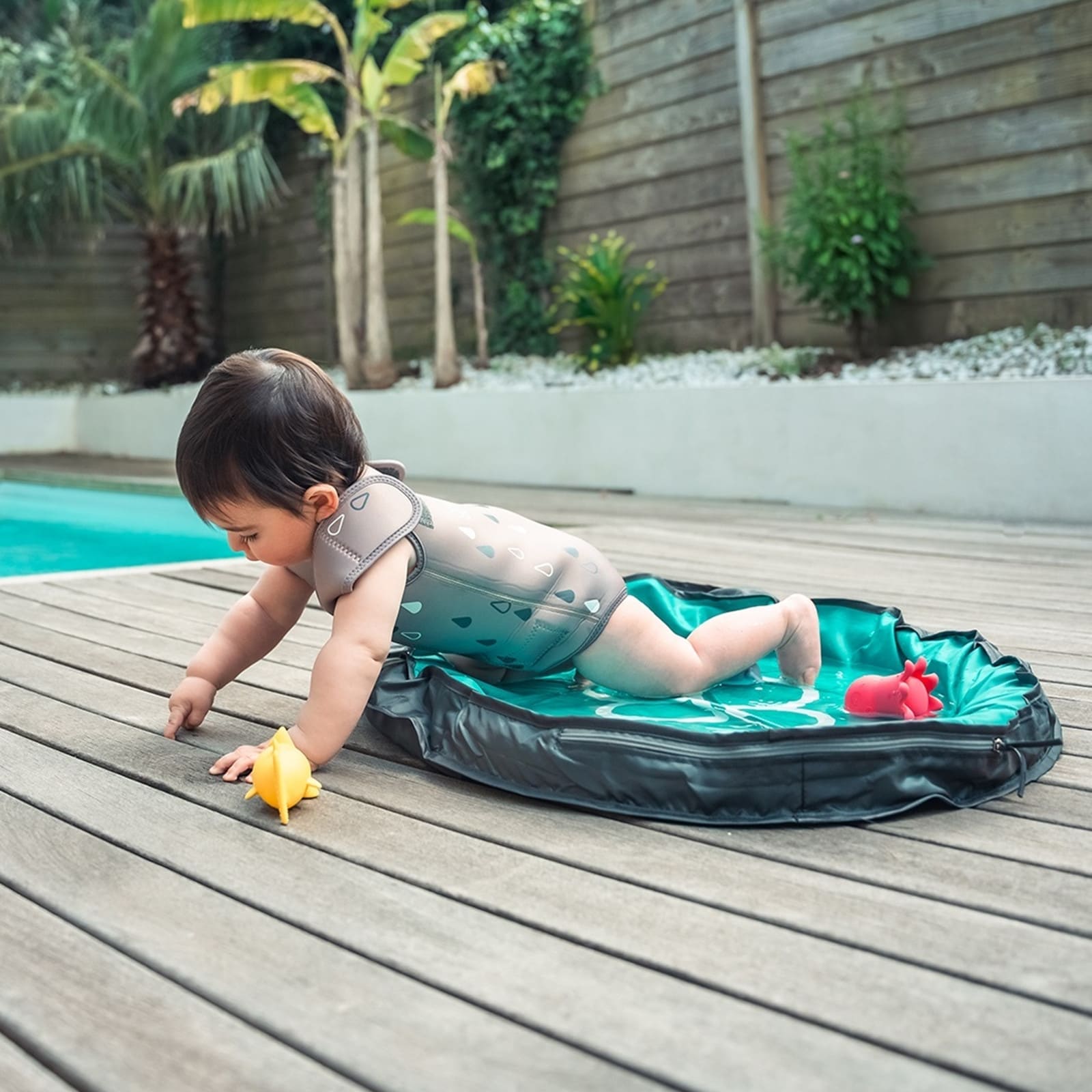 Selbst das wärmste Poolwasser kann sich auf der zarten Haut eines Babys kühl anfühlen. Mit dem Wräp aus superweichem Neopren macht Wasser spielen wieder Spass. Der Anzug hält Babys und Kleinkinder angenehm warm im Wasser und sorgt auch ausserhalb für Komfort, zusätzlich bietet er einen zuverlässigen Sonnenschutz mit SPF 50+. Mehrere praktische Klettverschlüsse machen das An- und Ausziehen ganz einfach, selbst für frischgebackene Eltern. Ausserdem gibt der Neoprenanzug im Wasser leichten Halt und unterstützt Eltern dabei, ihr Kind sicher zu tragen, während es neue Wassererfahrungen sammelt.