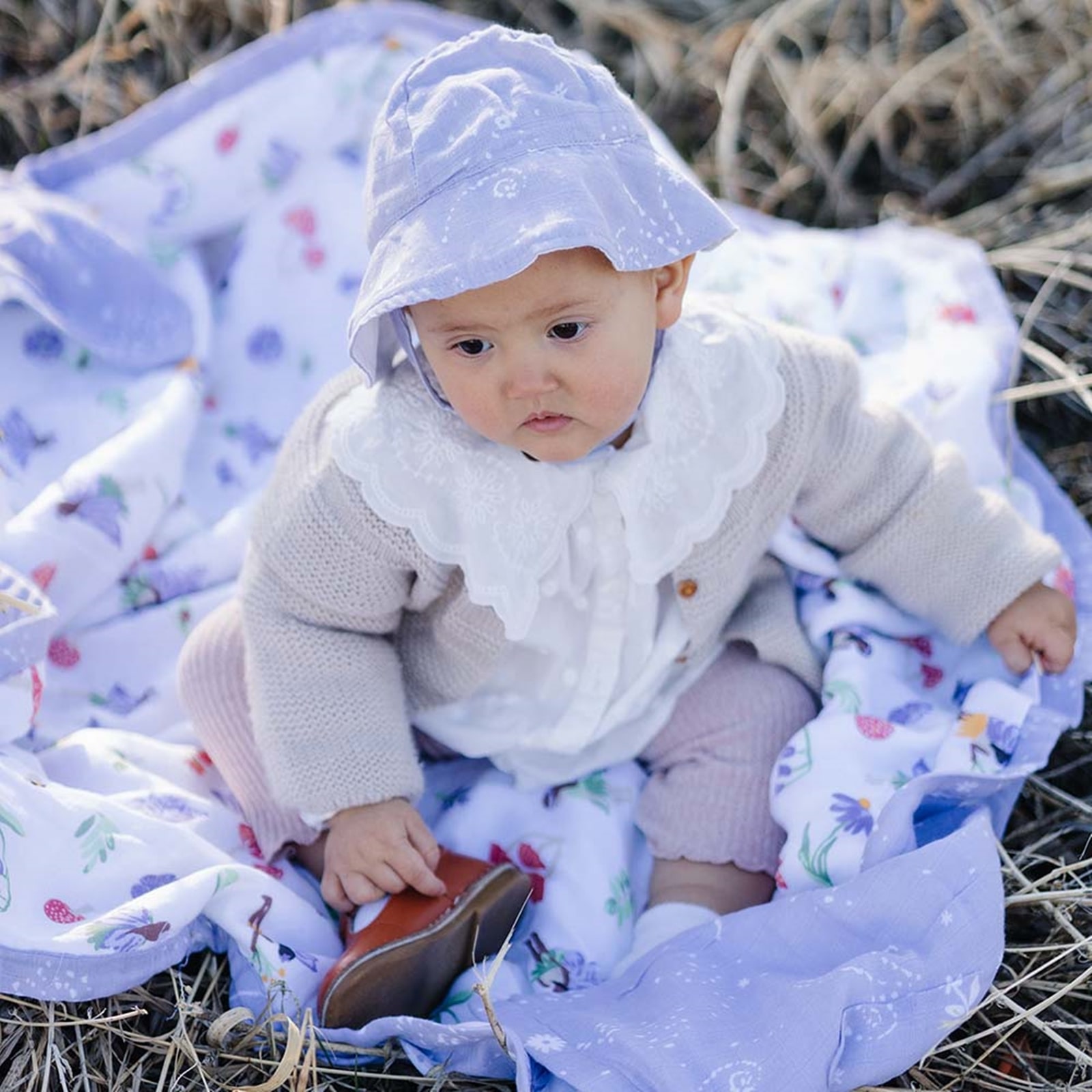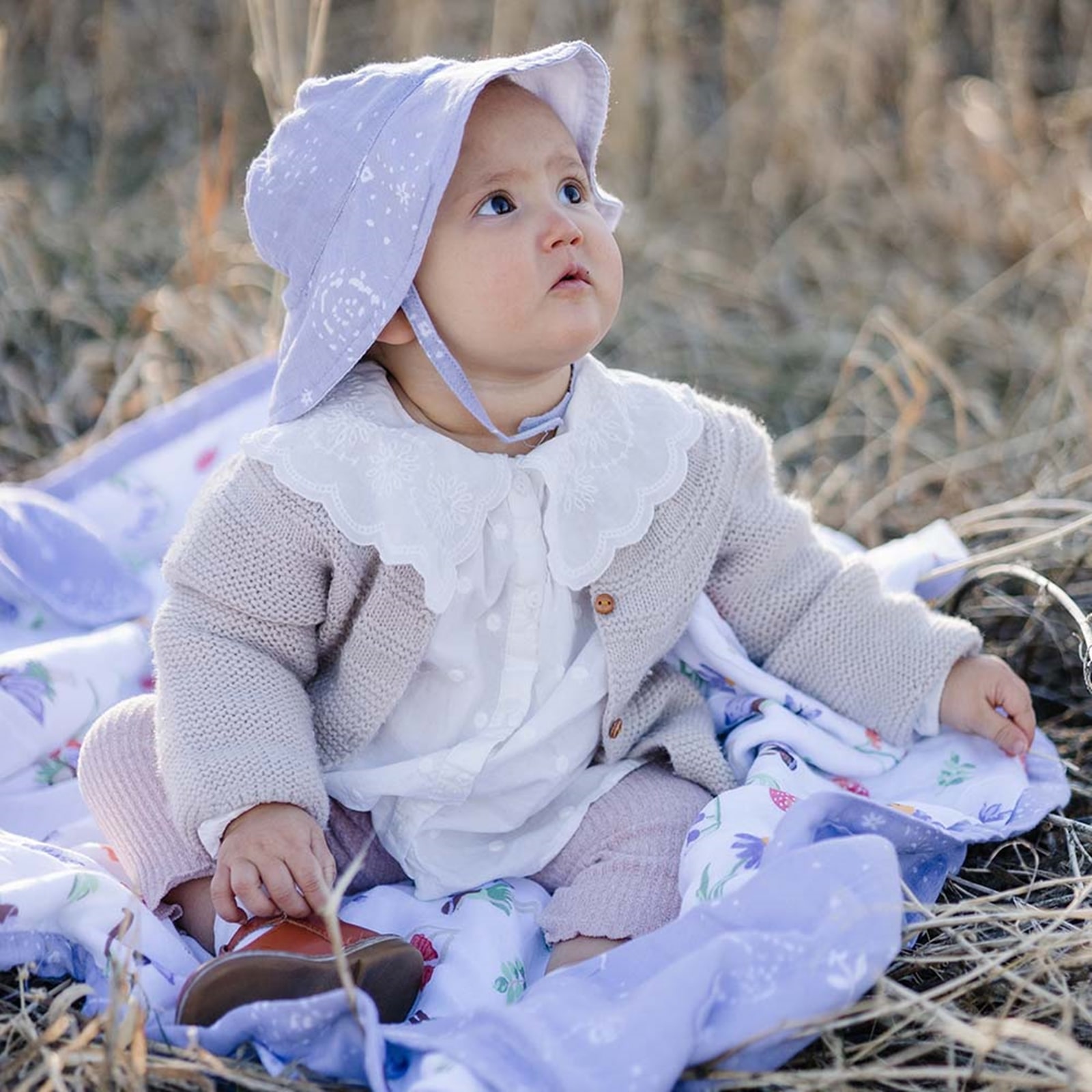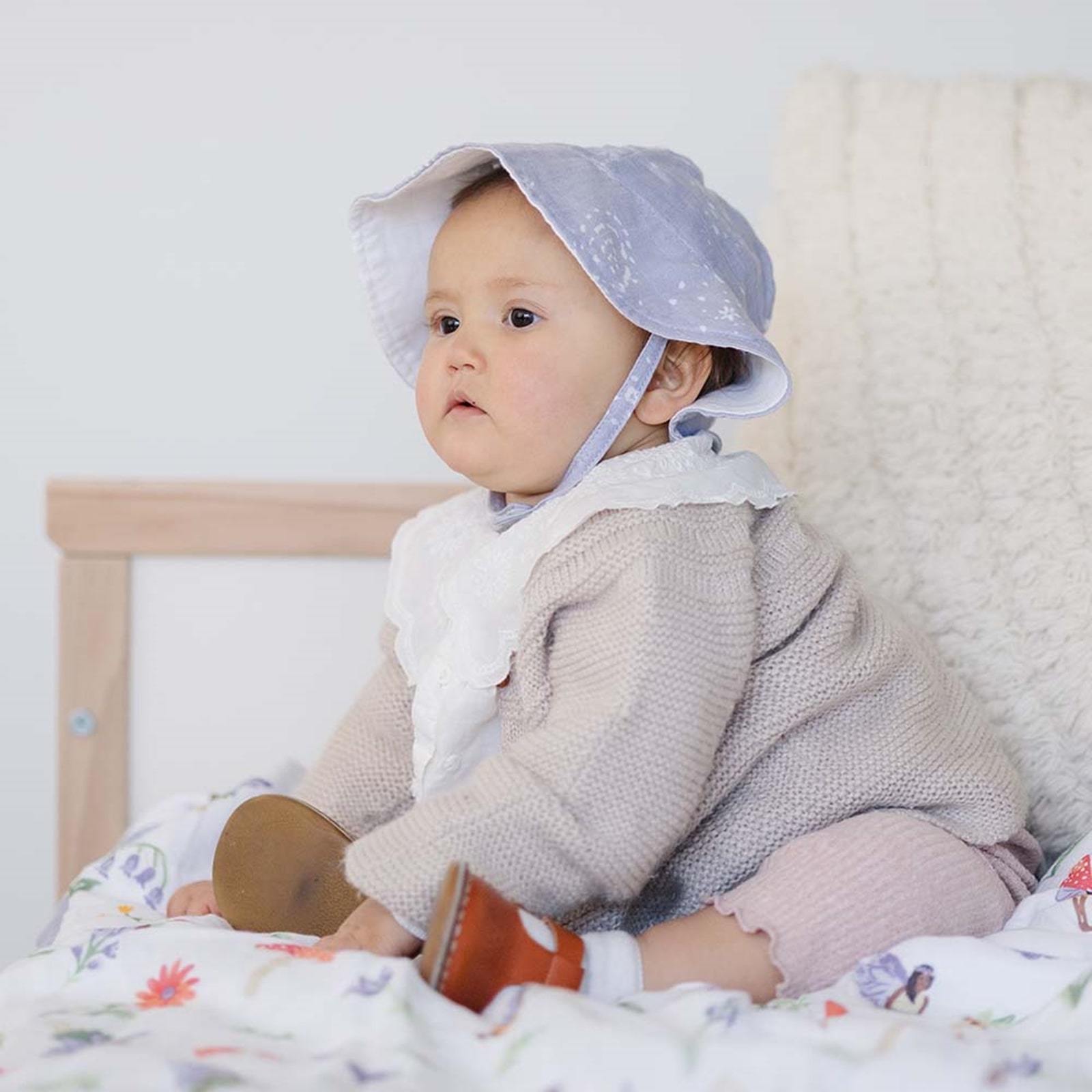 Das zarte Fairy Dust-Muster verleiht dem Hut eine freundliche Optik, die zu vielen Outfits passt und den Look deines Babys dezent ergänzt.