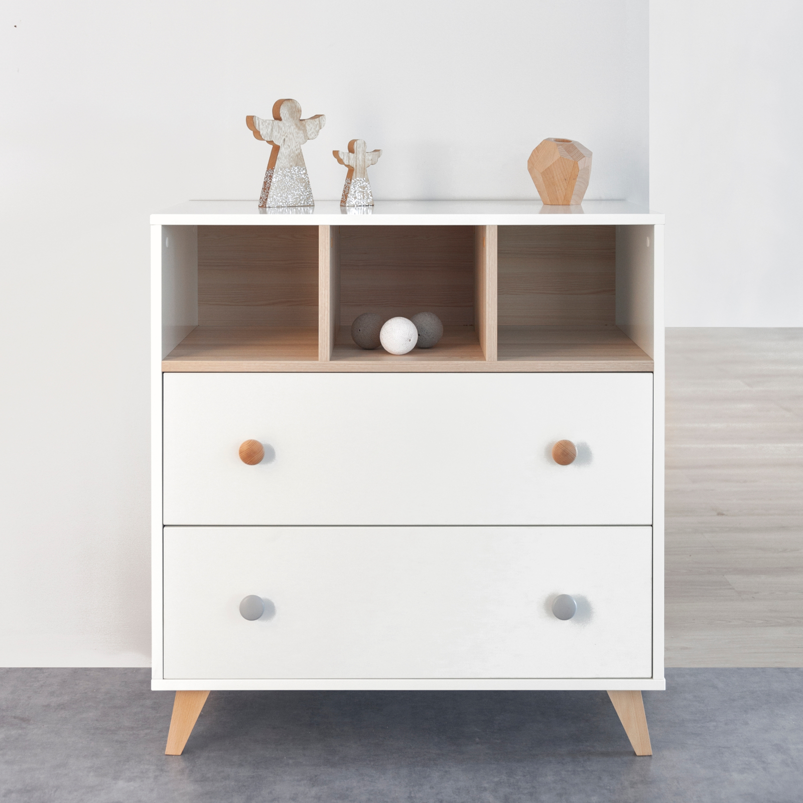 Die Colette Wickelkommode kombiniert einen weissen Korpus mit einem warmen Eichenholzeffekt und schafft so eine ruhige, harmonische Stimmung im Kinderzimmer. Schlichte Linien und hochwertige Oberflächen sorgen dafür, dass das Möbelstück sich leicht in verschiedene Einrichtungsstile einfügt.