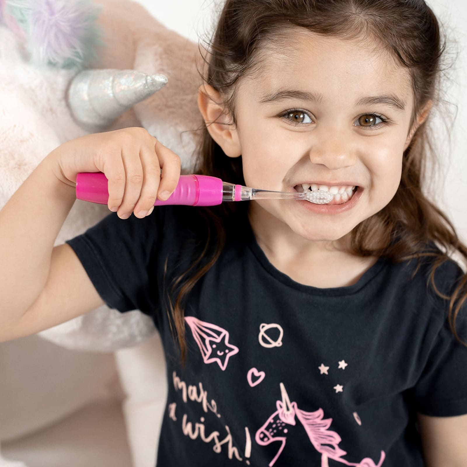 Mit ihrer Kombination aus Spielwert und Funktion unterstützt die KidzSonic Einhorn beim Erlernen gesunder Mundhygiene. Das zeitgesteuerte Putzen hilft, Routinen zu etablieren, und macht es Eltern leichter, richtige Putztechnik und Dauer zu vermitteln.