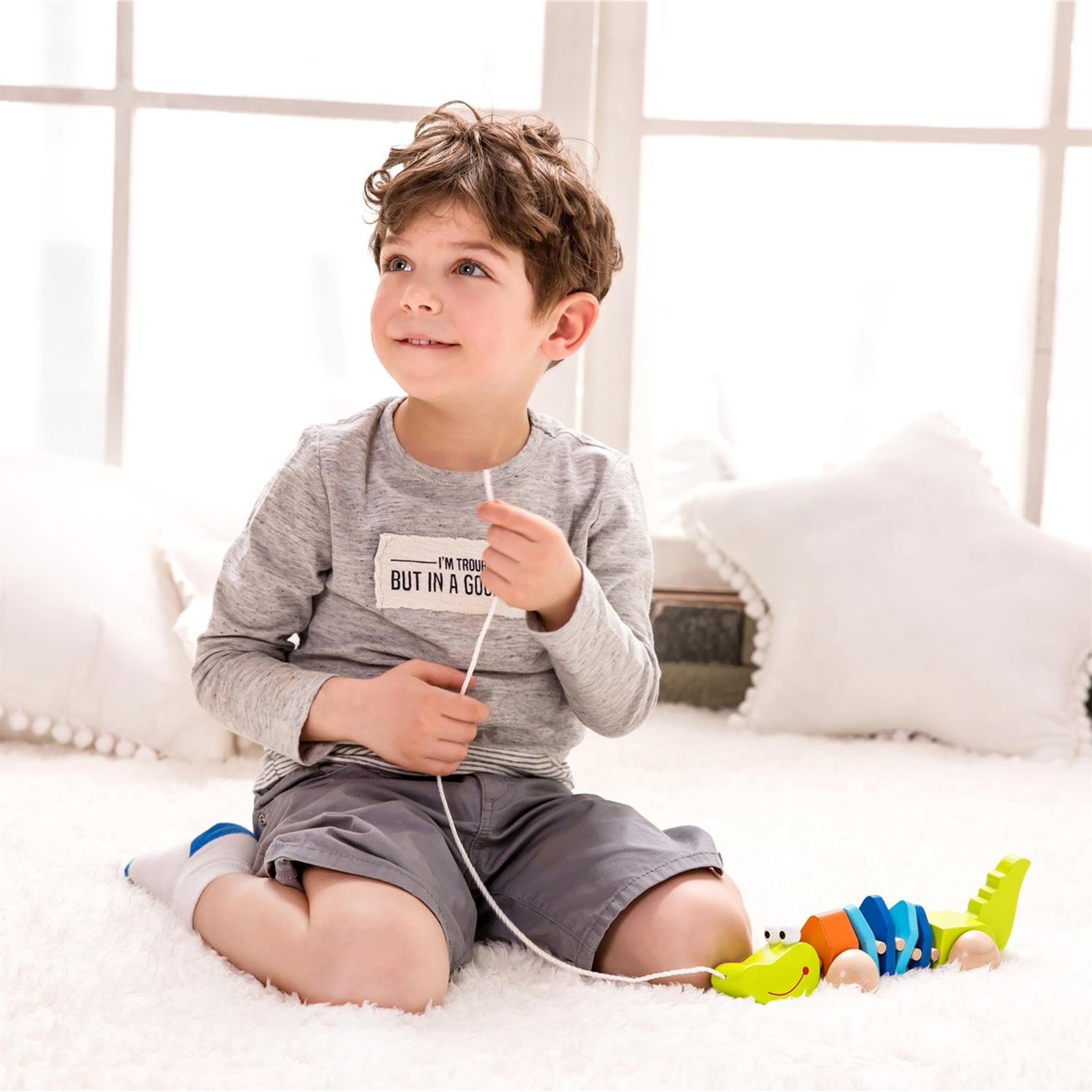 Das Ziehen des Krokodils unterstützt die Grobmotorik, stärkt Bein- und Rumpfmuskulatur und verbessert die Koordination. Durch das Zusammenspiel von Bewegung und Klang lernen Kinder einfache Ursache-Wirkung-Beziehungen kennen, was ihre kognitive Entwicklung fördert.