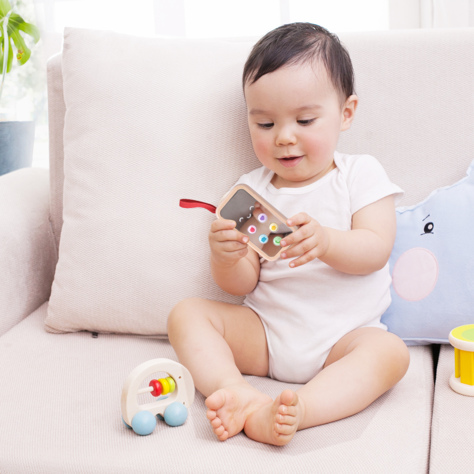 Dieses niedliche Holz-Handy lädt dein Kind zum Entdecken und Nachahmen ein. Ein kleiner Spiegel spiegelt das Lächeln deines Babys, während bunte Tasten und ein klingelnder Effekt beim Schütteln für Spielerlebnis sorgen. Ideal für Kinder ab etwa 10 Monaten.