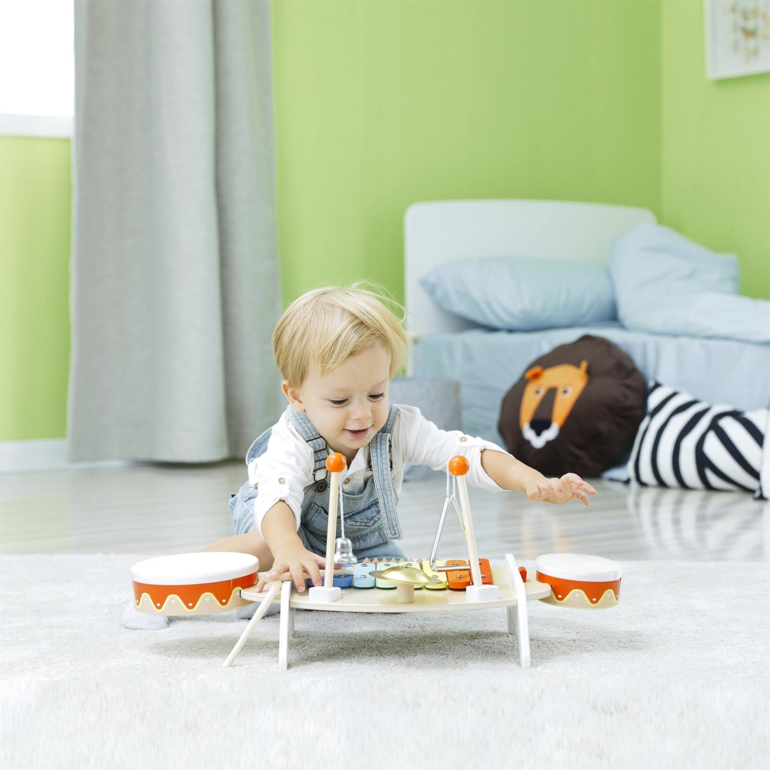 Der Tisch kombiniert Trommeln, ein Xylophon, eine Triangel, kleine Glöckchen und Zimbeln. Jedes Instrument liefert einen charakteristischen Klang, der das Hörvermögen schult und verschiedene Klangfarben erfahrbar macht.