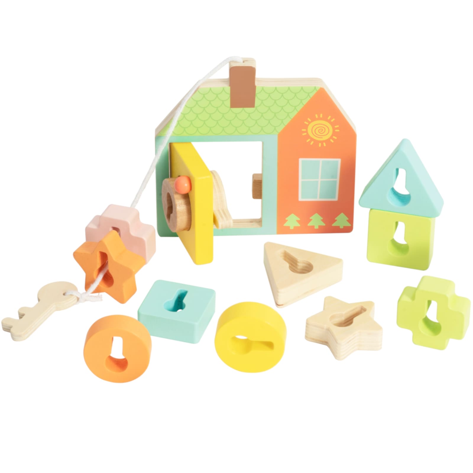 Mit verschiedenen Formen und einem Schlüssel können Kinder Türen öffnen, Formen einsetzen und die Mechanik des Schlosses erforschen. Das wiederholende Spiel vermittelt einfache Ursache-Wirkungs-Zusammenhänge und sorgt für anhaltenden Spielspass.