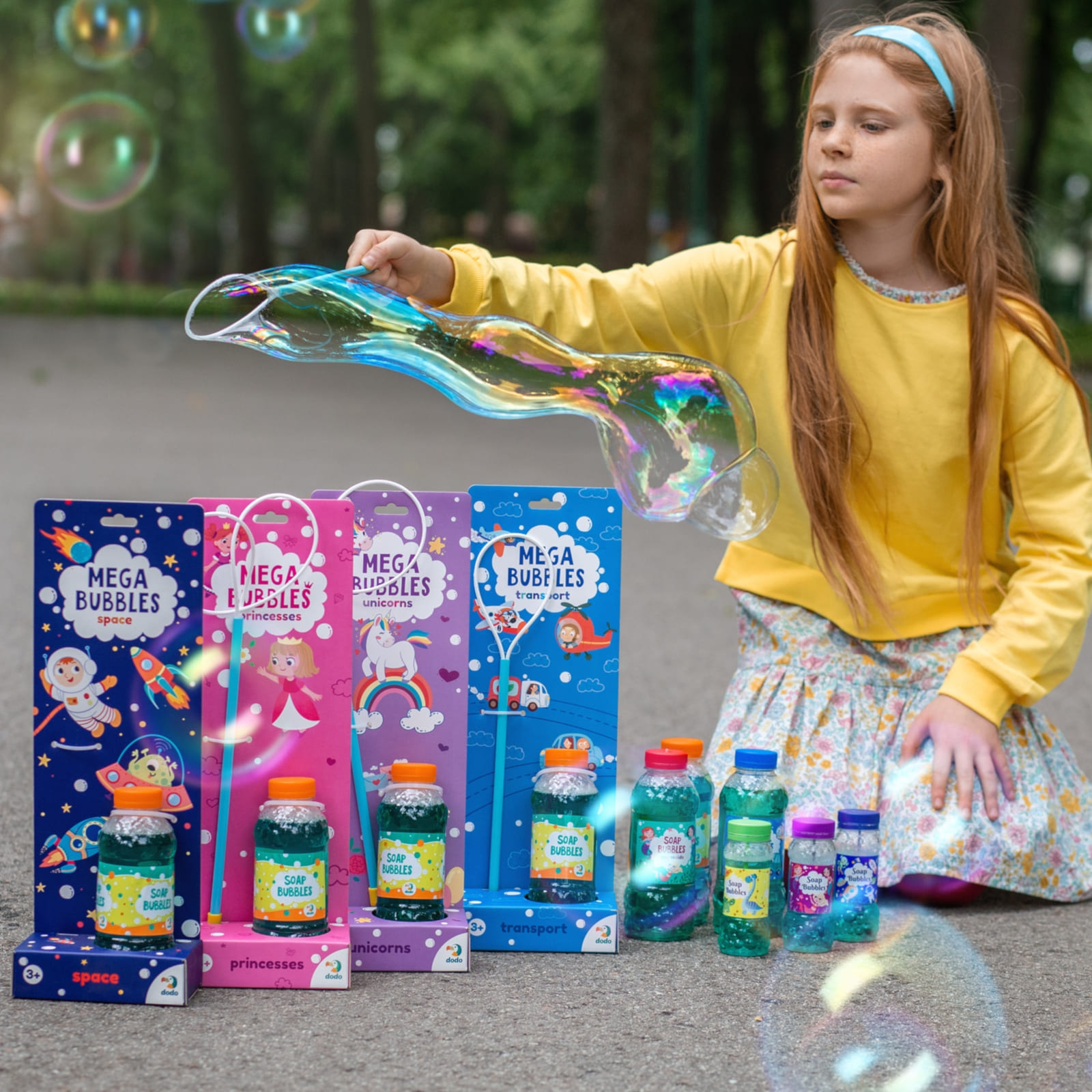 Zum Set gehört eine 450 ml Flasche hochwertige Seifenlösung sowie ein stabiler Stab mit Seil, das in einer oder zwei Schlaufen verwendet werden kann. So lassen sich einfache bis sehr grosse Blasen in unterschiedlichen Formen erzeugen. Das Set ist sofort einsatzbereit und benötigt keine Vorbereitung.