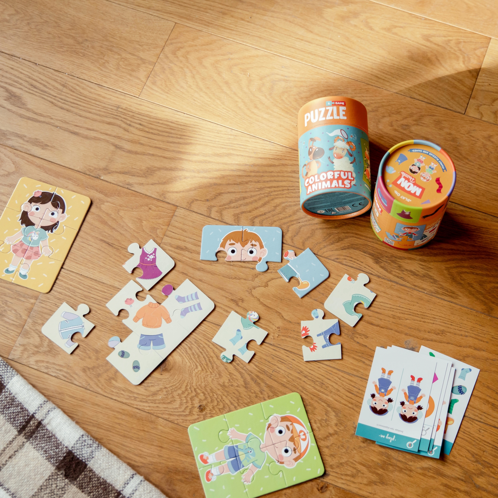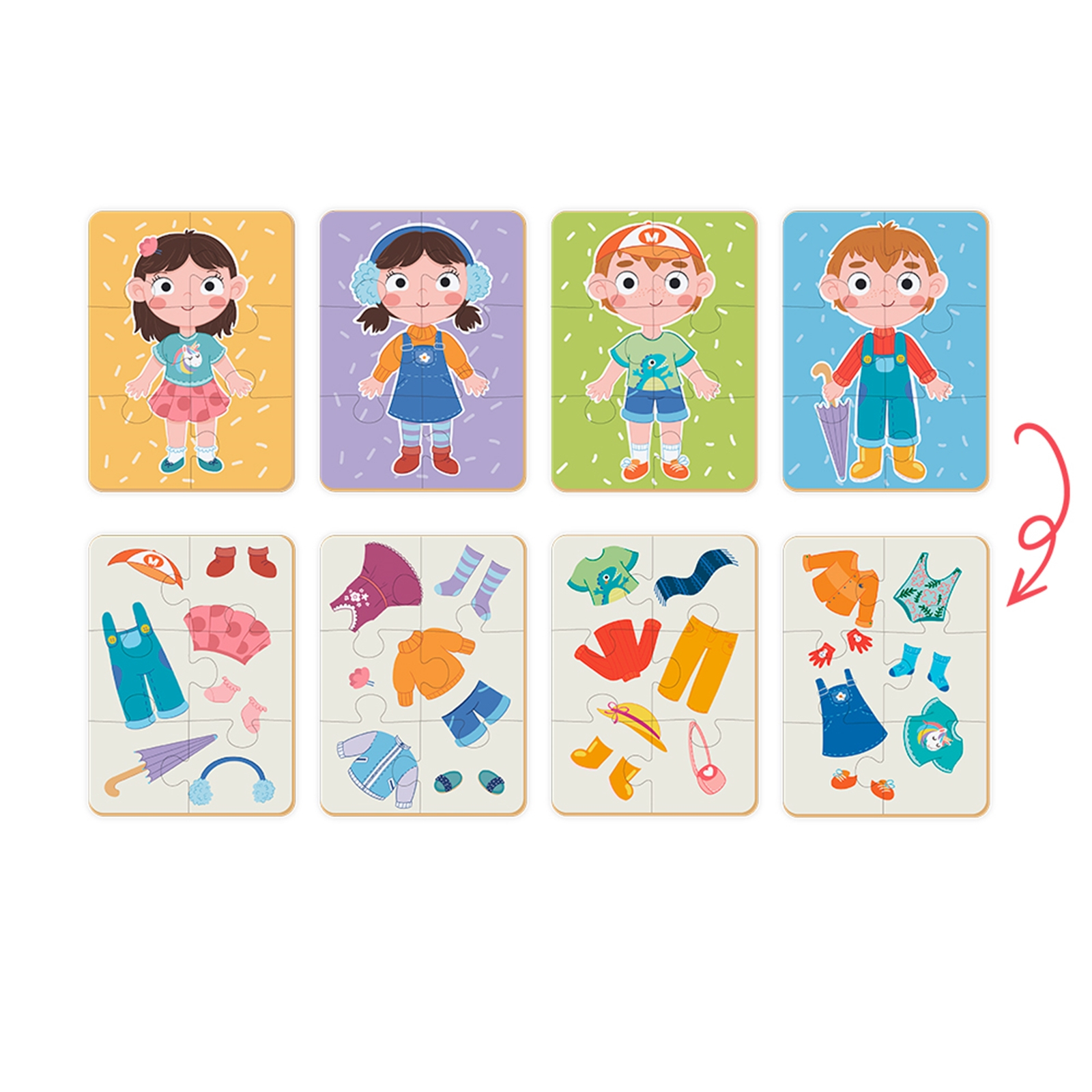 Das DODO MonPuzzle kombiniert zwei Spielideen in einem: Auf der einen Seite siehst du einen Jungen und ein Mädchen, auf der anderen Seite passende Kleidungsstücke zu Frühling, Sommer, Herbst und Winter. Vier doppelseitige Puzzles mit je sechs Teilen sorgen für abwechslungsreichen Spielspass und viele Kombinationsmöglichkeiten.