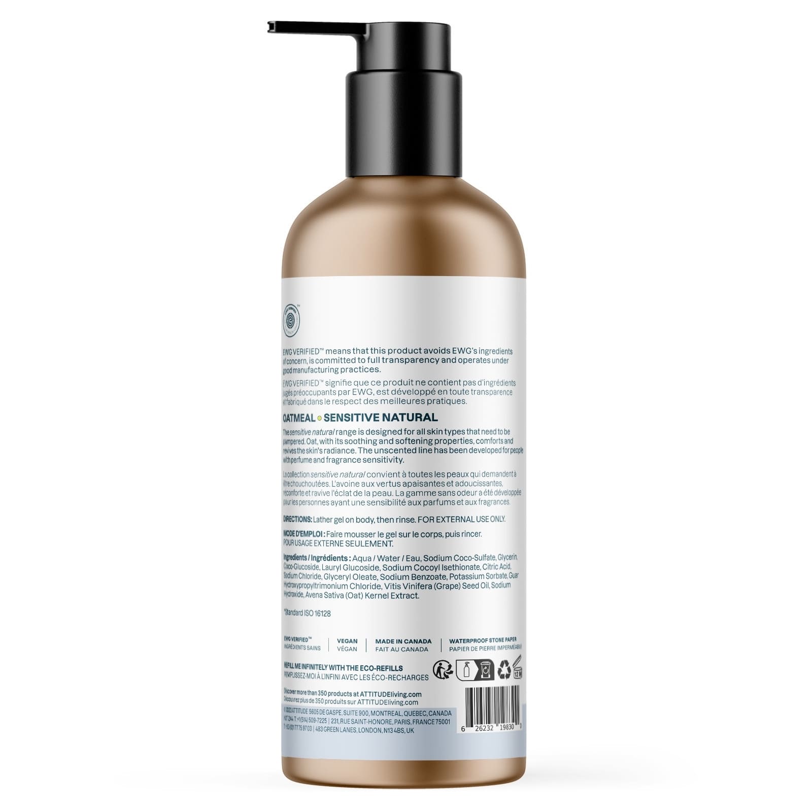 Le gel douche naturel ATTITUDE Sensitive est idéal pour nettoyer en douceur les peaux sensibles. Sa formule, composée à 98 % d'ingrédients d'origine naturelle, est sans parfum et enrichie en extrait d'avoine, reconnu pour ses propriétés apaisantes et son action bénéfique sur les peaux sèches. Présenté dans un flacon en aluminium élégant, minimaliste et rechargeable, il trouvera sa place dans jaque salle de bain. Grâce à sa formule végane, testée dermatologiquement et approuvée par l'EWG, t’appréciera sa mousse légère et onctueuse. Ingrédients: Eau, Sodium Coco-Sulfate, Glycérine, Coco-Glucoside, Lauryl Glucoside, Sodium Cocoyl Isethionate, Acide citrique, Chlorure de sodium, Benzoate de sodium, Glyceryl Oleate, Sorbate de potassium, Chlorure de Guar Hydroxypropyltrimonium, Huile de pépins de raisin (Vitis Vinifera), Extrait de noyau d'avoine (Avena Sativa)
