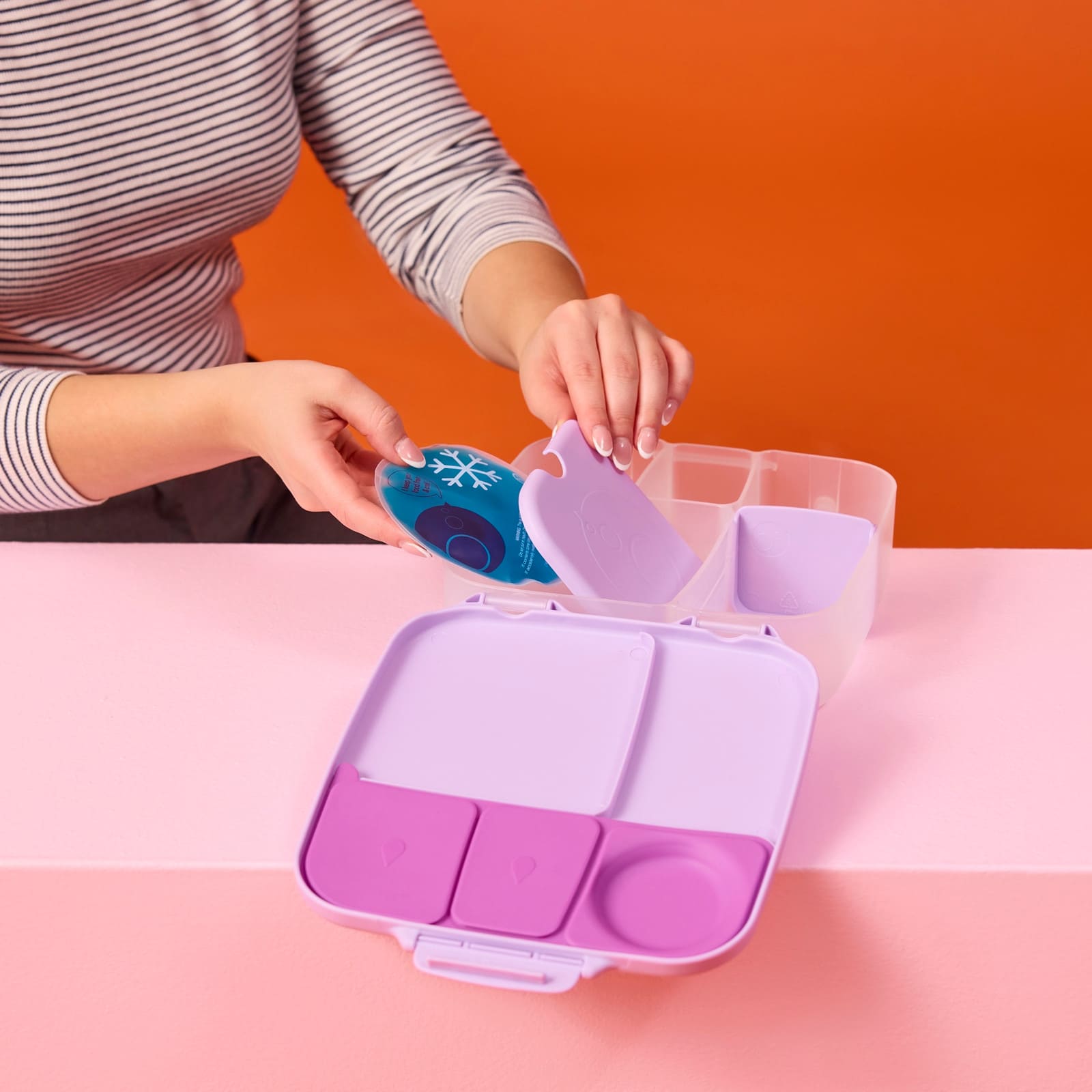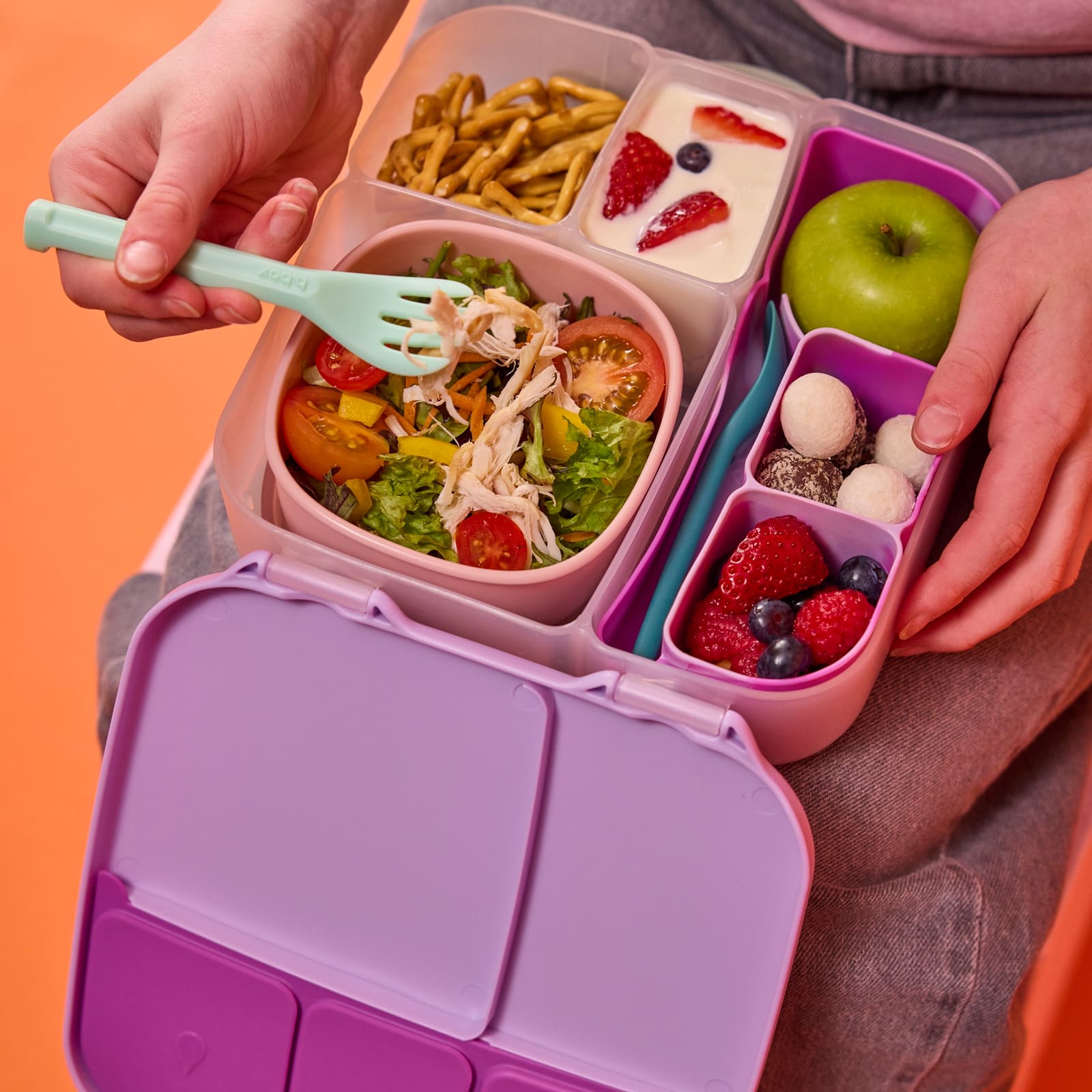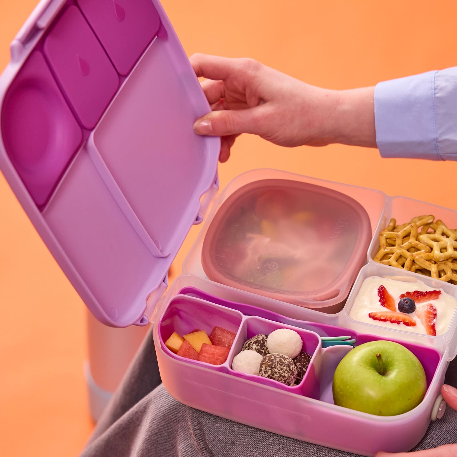 La boite à repas a été imaginée pour les enfants actifs et affamés. Grand compartiment pouvant contenir un sandwich entier, et plus encore. Plateau amovible pour accueillir des salades ou des pâtes. Poche réfrigérante incluse pour garder les aliments au frais, plus longtemps. Le séparateur amovible offre plus d'options de compartimentation. Cette boite à repas pour enfant dispose d’un support unique en silicone souple qui permet de contenir une pomme entière. Tu n'auras donc plus à la couper en petits morceaux, évitant ainsi que le fruit brunisse dans un sac. Retire le séparateur pour l'adapter à une banane entière. Boite à sandwich avec compartiments étanches dédiés aux aliments humides avec joint en silicone, pour éviter tout déversement. Place-y du yaourt, des sauces, de la confiture, du melon et plus encore. Cette boite à déjeuner compartimentée pour enfant comprend une grande fermeture à clip et une poignée facile à saisir pour une plus grande autonomie. Il suffit de retirer l'insert en silicone et de laver la boîte à la main. Ne la mettez pas au lave-vaisselle.