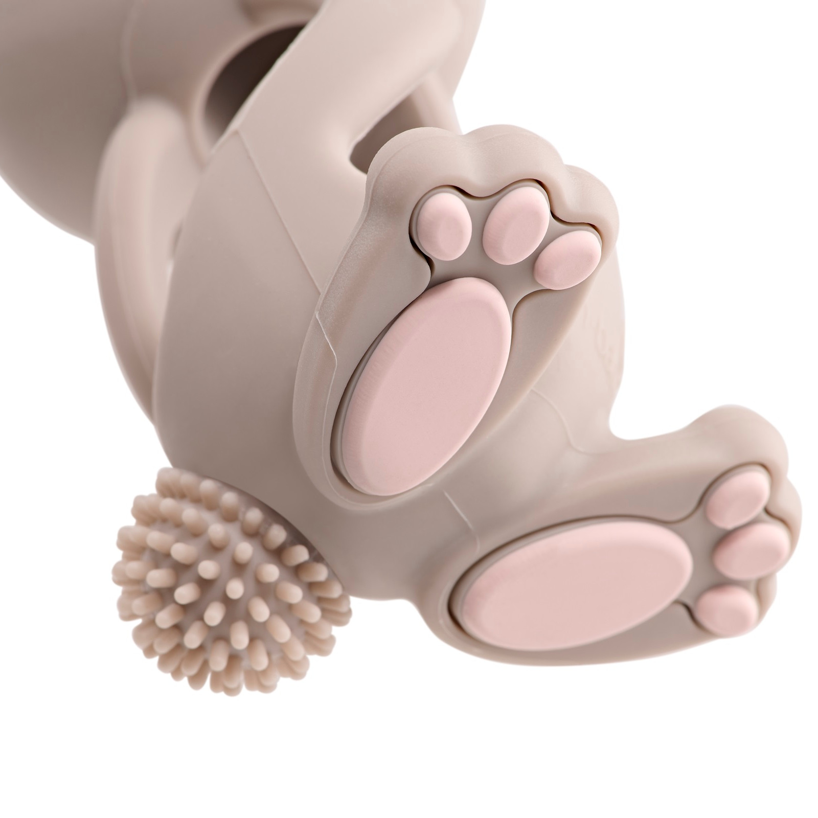 Les zones texturées différentes sur les pieds, les oreilles et la queue de Bobbie Bunny méritent une mention particulière. Elles ont été spécialement conçues pour offrir un soulagement optimal au bébé à toutes les étapes de la poussée dentaire. Grâce à ce matériau varié, les muscles de la mâchoire peuvent se détendre et les gencives sont doucement massées. Les différentes textures incitent à l'exploration et invitent simultanément à mâcher, ce qui stimule le réflexe naturel de mastication.