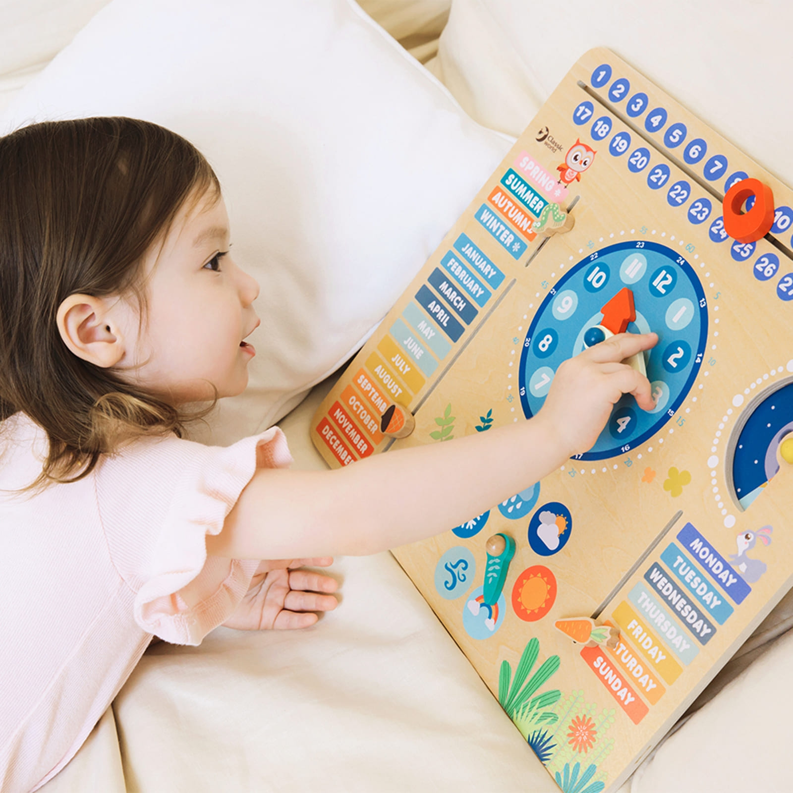 En regardant et en réglant ensemble les différentes parties du calendrier, les enfants enrichissent leur vocabulaire autour des thèmes du temps, de la météo et de la nature. Ils entraînent aussi des compétences importantes comme la concentration, la patience et la motricité fine.