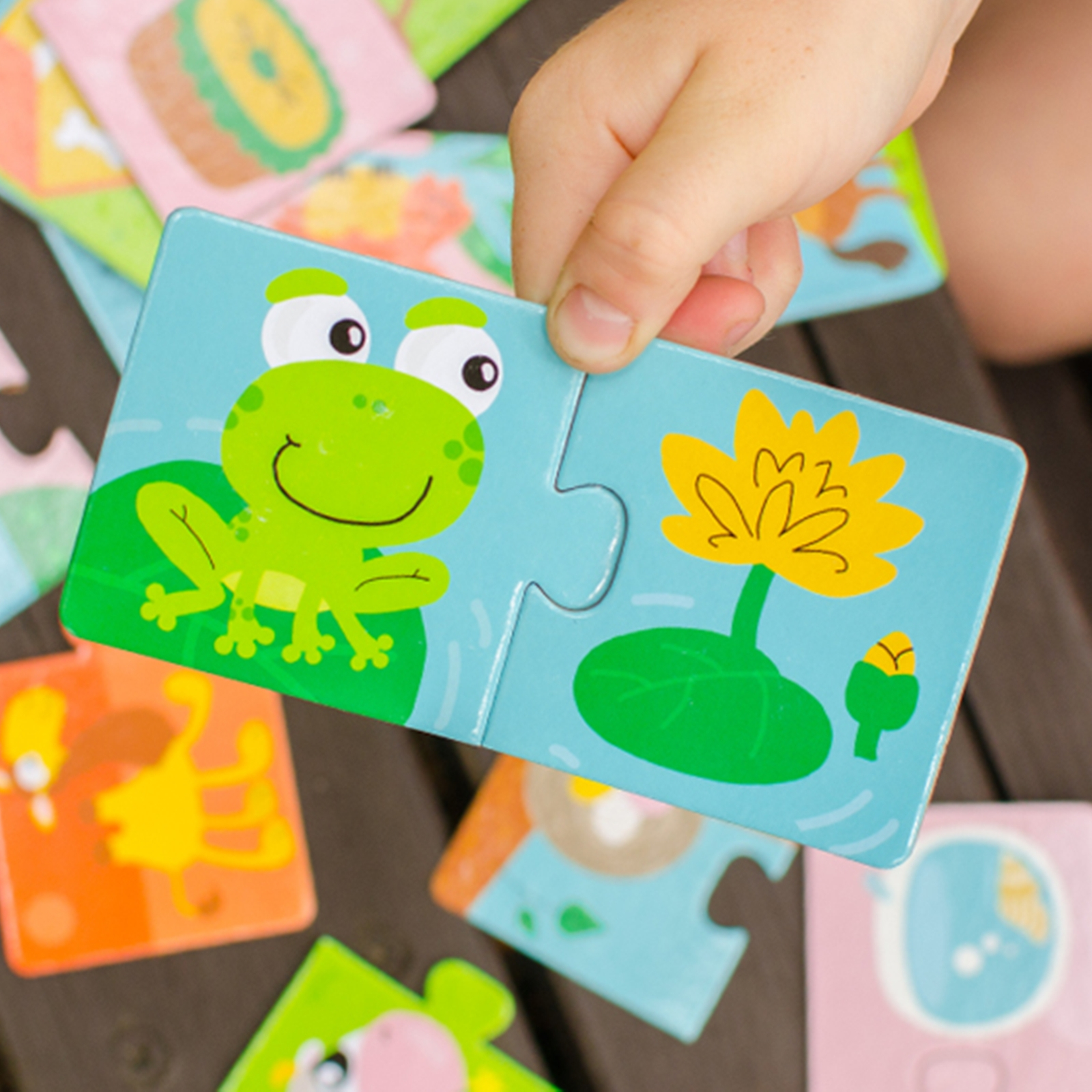 Les pièces maniables sont assez grandes pour faciliter la prise en main et l'assemblage, ce qui les rend particulièrement adaptées aux petites mains des enfants. Chaque puzzle forme une paire d'images harmonieuse que les enfants peuvent assembler de manière intuitive. Ce set est idéal pour entraîner à la fois les compétences linguistiques et la pensée logique.