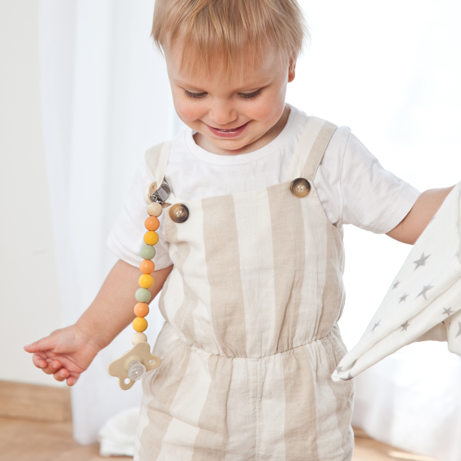 Les couleurs et formes inspirées de l'automne font de la chaîne de tétine « Automne » un compagnon à la fois élégant et pratique. Elle s'harmonise parfaitement avec la tenue de votre bébé et apporte des accents discrets. Le design est intemporel et convient à de nombreuses situations quotidiennes, à la maison comme en déplacement.