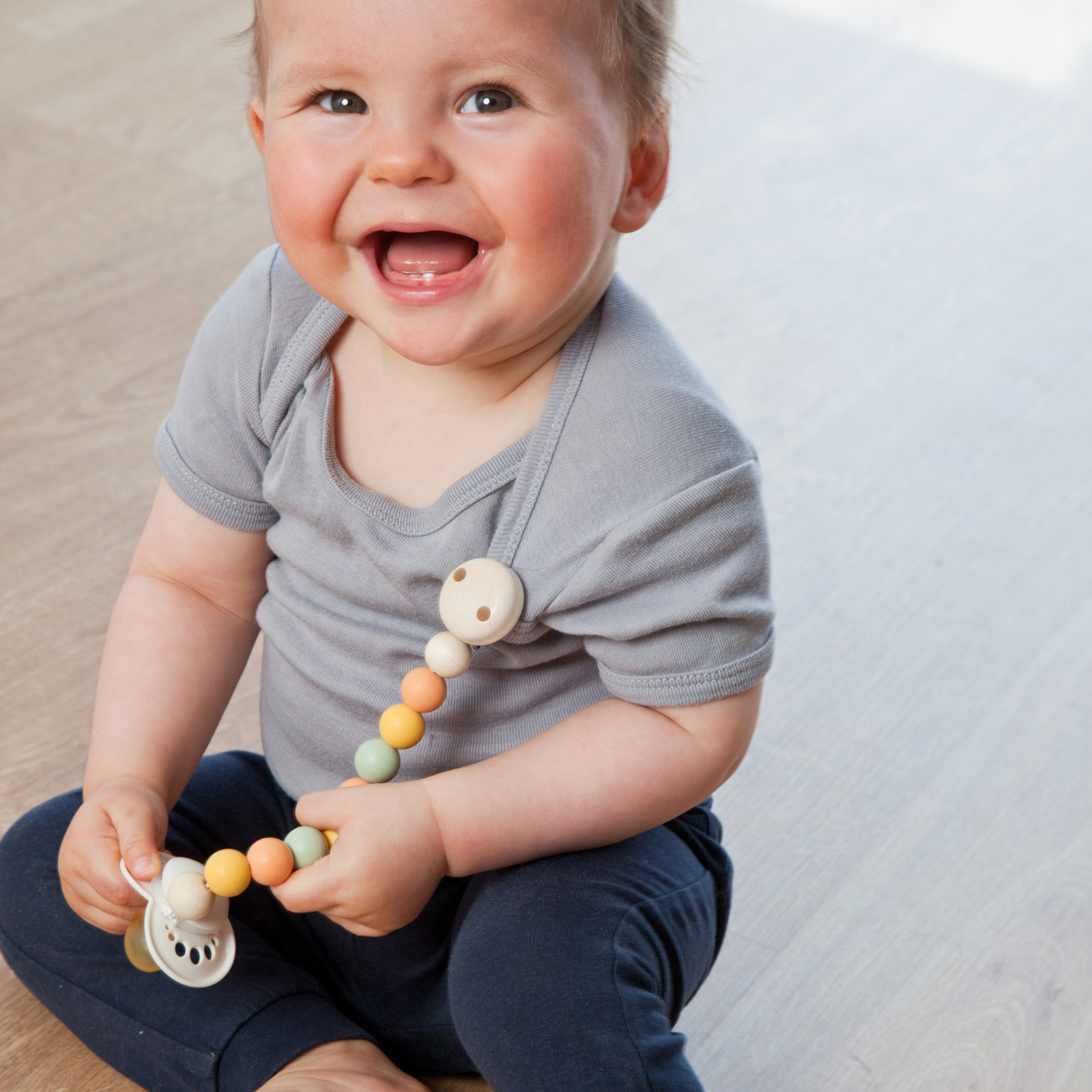 L'anneau en silicone intégré permet une fixation simple et sûre des tétines avec ou sans anneau. De plus, d'autres petits compagnons comme des hochets ou des anneaux de dentition peuvent également être attachés, ce qui rend la chaîne de tétine polyvalente dans la vie quotidienne. Cette polyvalence garantit que la tétine reste toujours à portée de main et ne se perd pas.