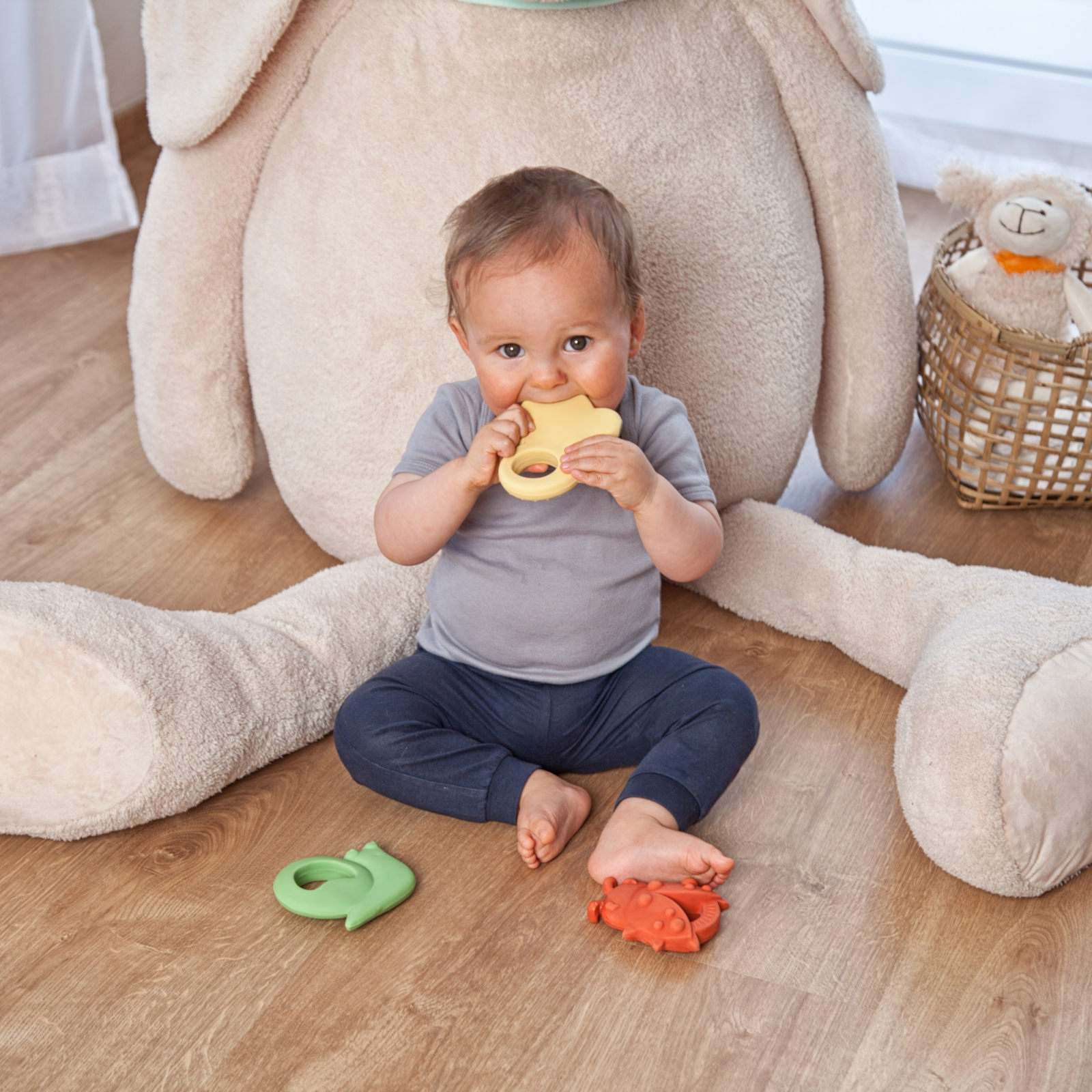 Le jouet biologique est fabriqué à partir de caoutchouc naturel de haute qualité, ce qui le rend particulièrement doux et sûr. Les parents peuvent laisser leur bébé jouer avec en toute tranquillité – le matériau est exempt de substances nocives et parfaitement adapté pour être mâché. Ainsi, le jouet soutient en douceur le processus naturel de poussée dentaire. Sa surface structurée masse les gencives sensibles et soulage les douleurs pendant la poussée des dents. La forme ergonomique facilite la préhension et favorise la motricité buccale.