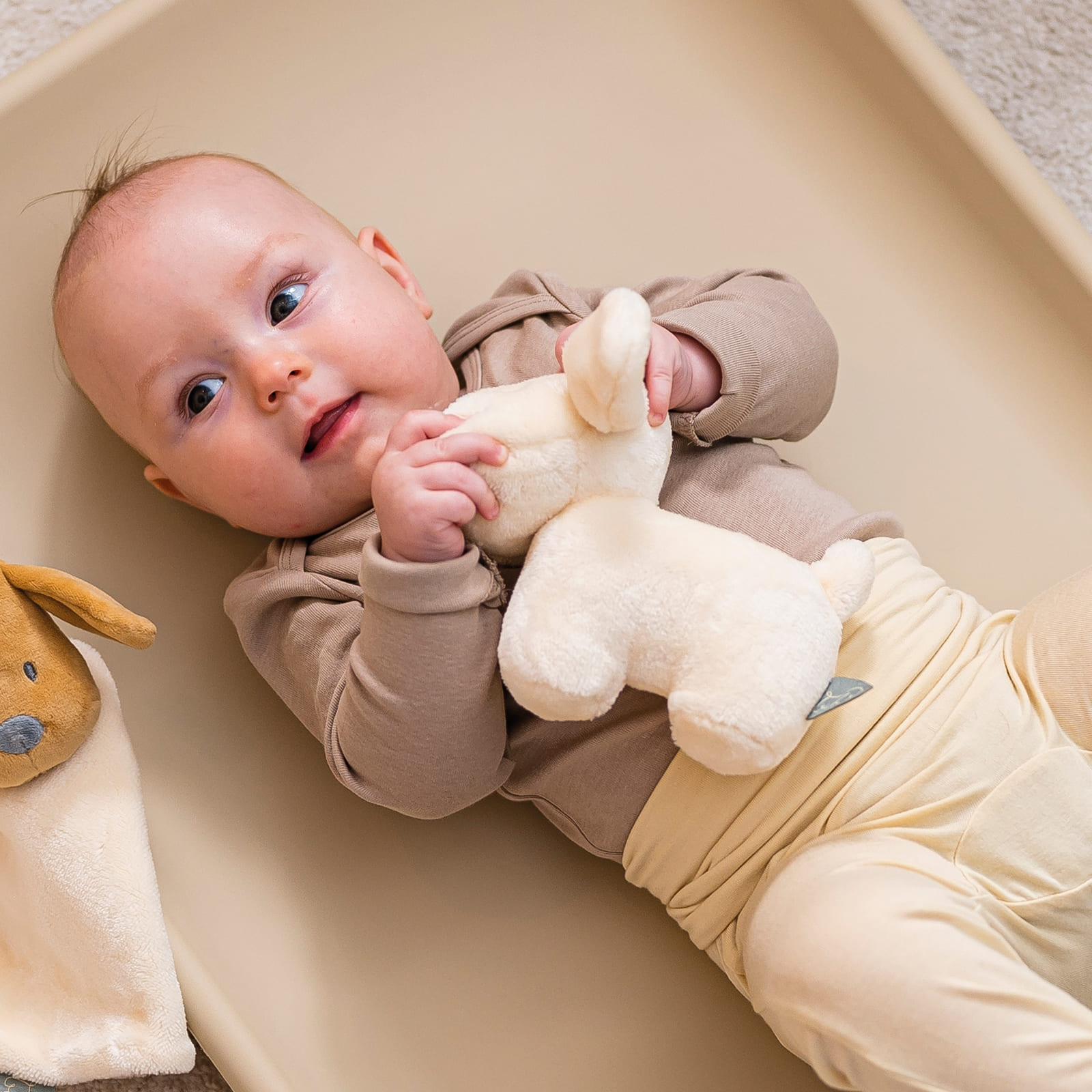 Grâce au hochet intégré, le jouet devient un compagnon interactif qui invite également à se câliner. Une relation affectueuse entre l’enfant et le hochet se crée ainsi et dure longtemps.