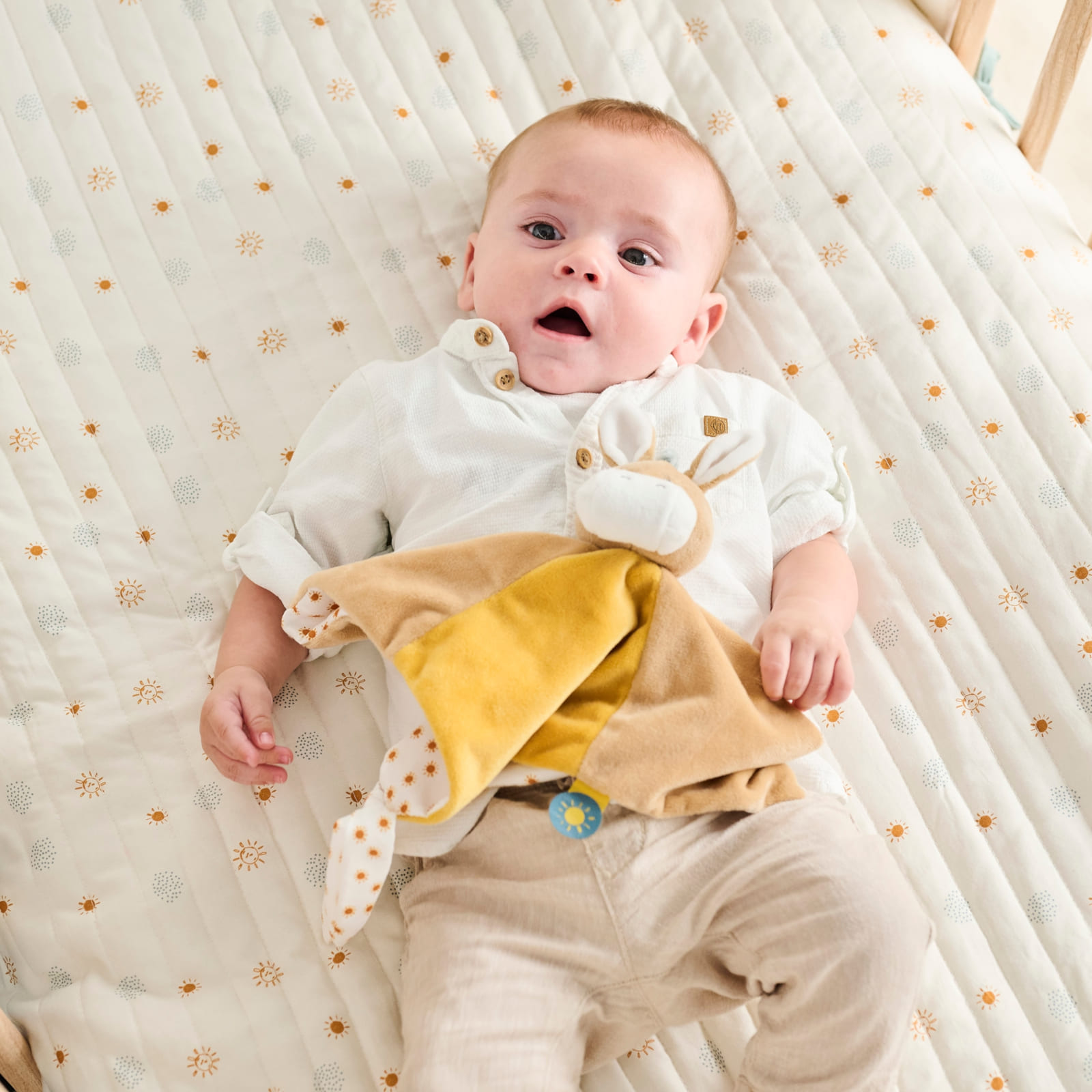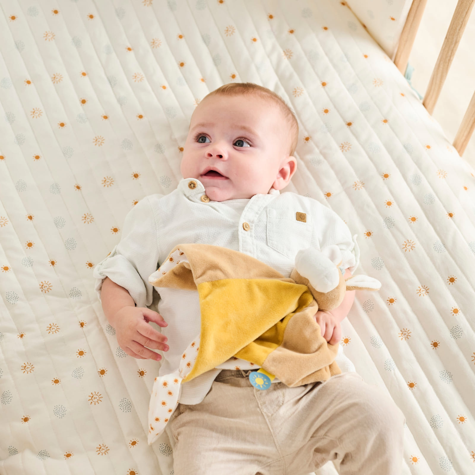Le doudou tout doux, muni d’un nœud qui accueillera la sucette de ton bébé.