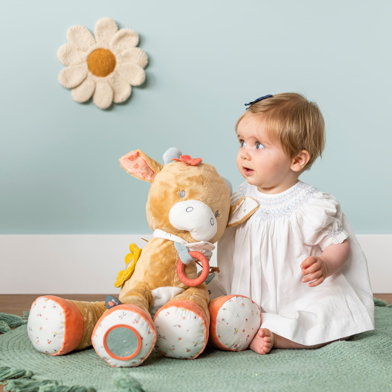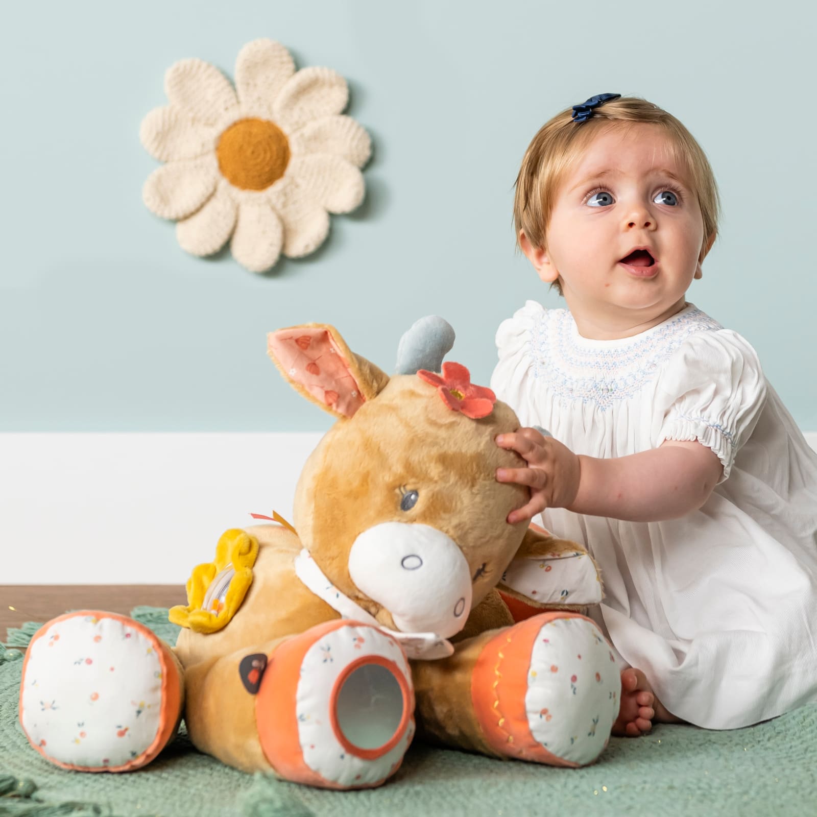 Le jeu avec la peluche favorise le développement des réflexes de préhension ainsi que les capacités motrices, ce qui est particulièrement important durant les premiers mois de vie. Mila accompagne affectueusement votre bébé dans ce chemin de découverte.