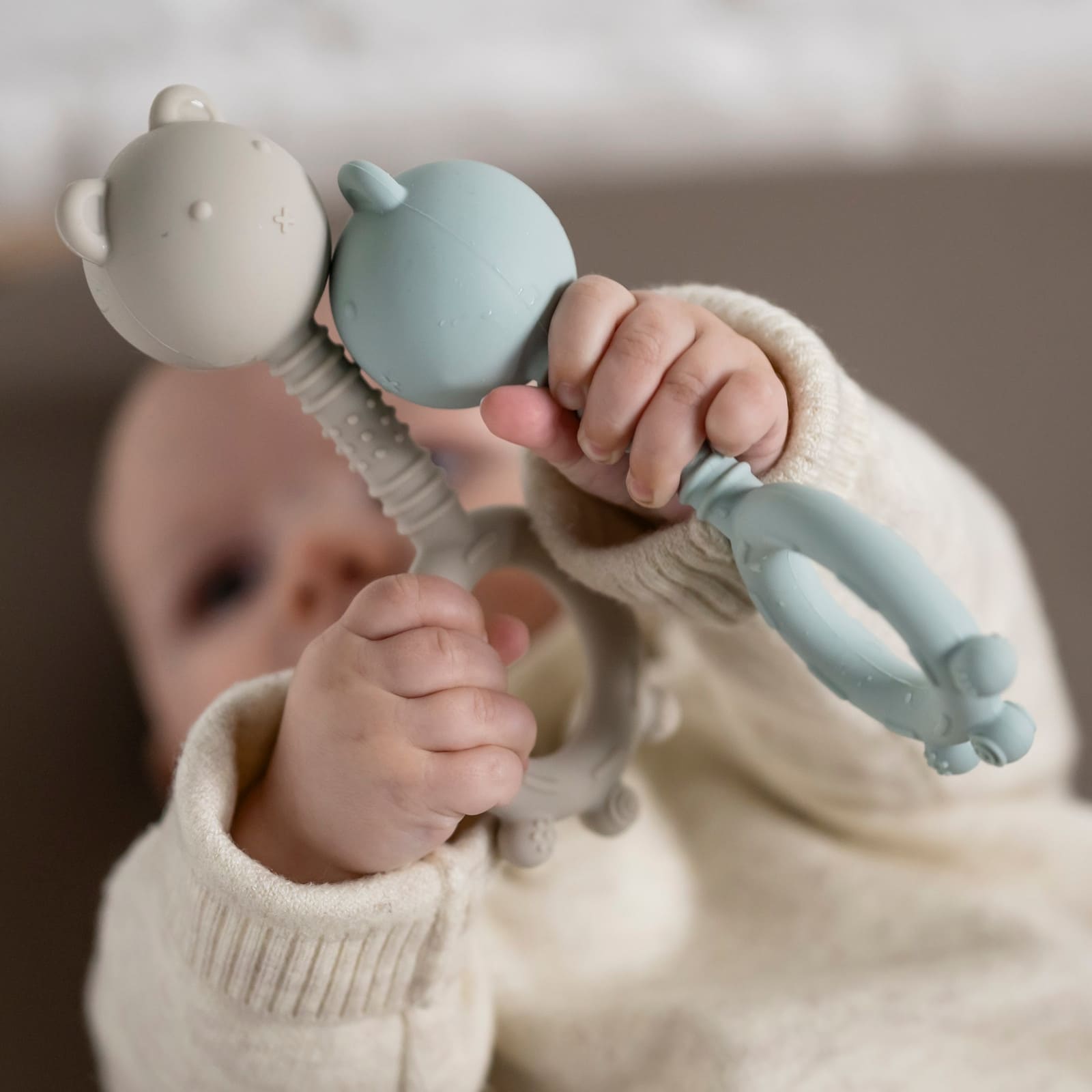 L’anneau de dentition est en silicone de haute qualité, exempt de substances nocives et donc entièrement sans danger pour les bébés. La surface douce offre une prise parfaite pour mâcher et presser et stimule délicatement les gencives. Cela soutient le développement naturel des dents et atténue les douleurs. Les formes lisses et arrondies de l’ours garantissent qu’il n’y a aucun risque de blessure – même lors d’explorations avides avec la bouche et les mains.