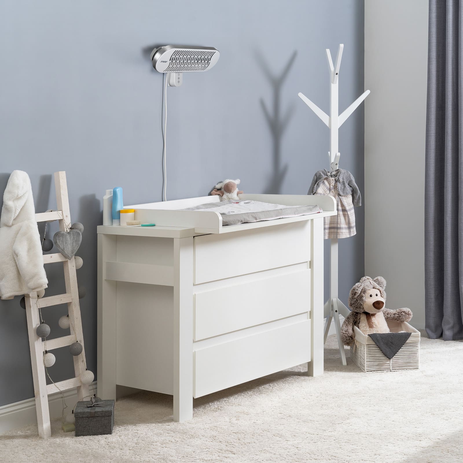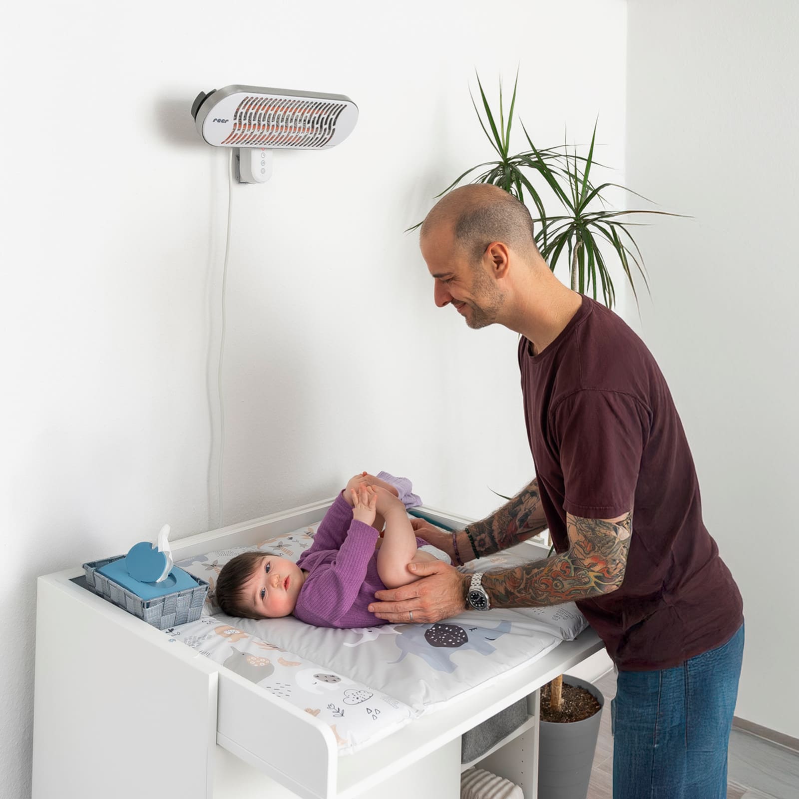 Le radiateur à infrarouge pour table à langer assure une répartition uniforme de la chaleur et de la température. Son élément chauffant innovant en carbone infrarouge permet un réchauffement rapide et une efficacité thermique optimale, tandis que la chaleur est parfaitement absorbée par la peau de bébé. Deux niveaux de chauffage (350 / 700 W) offrent une puissance ajustable, contrôlable facilement via le panneau de commande ou la télécommande fournie. Un minuteur intégré apporte confort et sécurité supplémentaires. Son design moderne et compact s’intègre harmonieusement dans tout intérieur. Le radiateur est fabriqué en métal et en plastique, équipé d’un câble de 180 cm avec fiche de sécurité, et livré avec une télécommande incluant une pile CR2025.