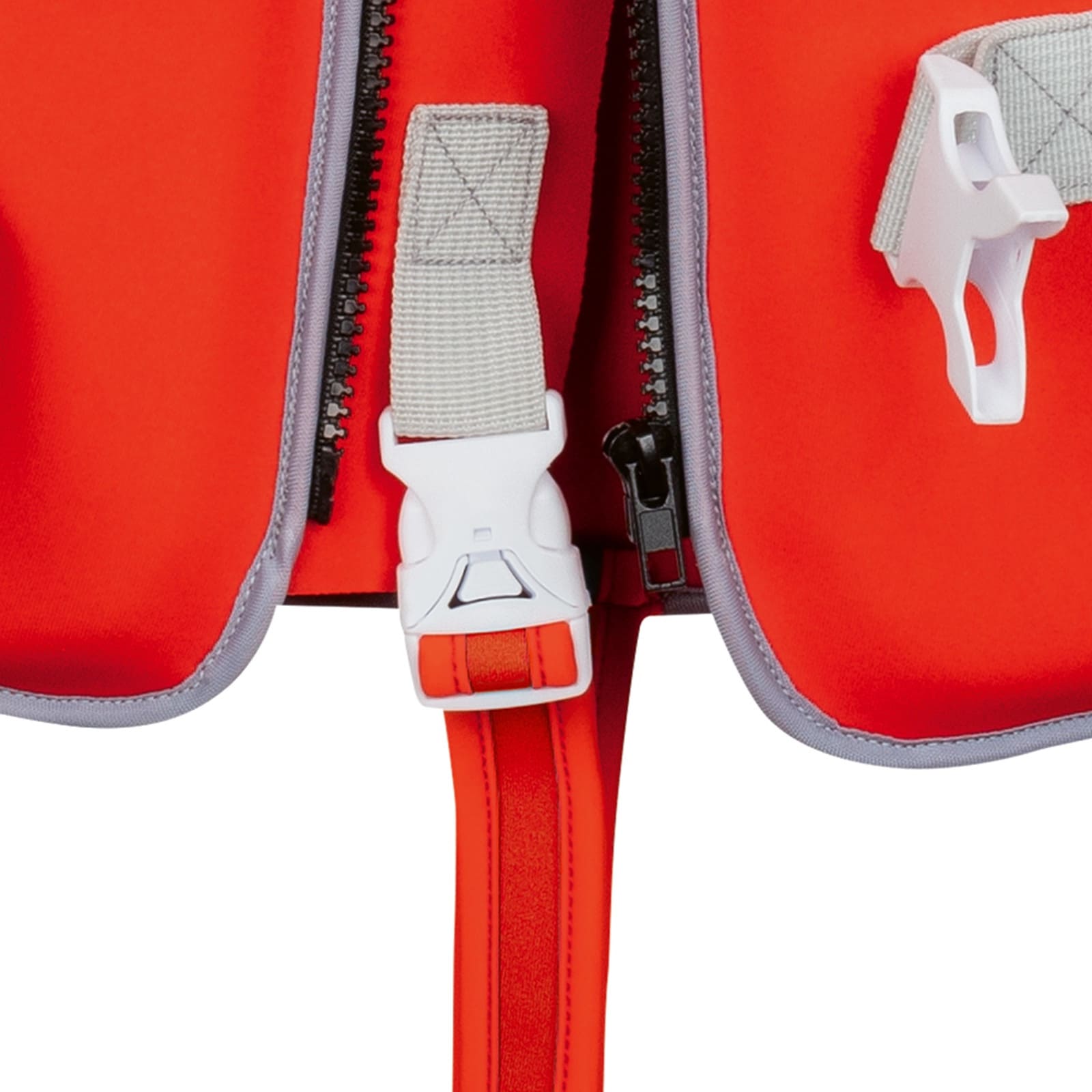 La fermeture à double poignée sécurisée pour enfants sur la sangle d’entrejambe assure que le gilet ne glisse en aucun cas dans l’eau. Cette conception est spécialement conçue pour empêcher les enfants de se détacher seuls, tandis que les parents gardent un contrôle total.