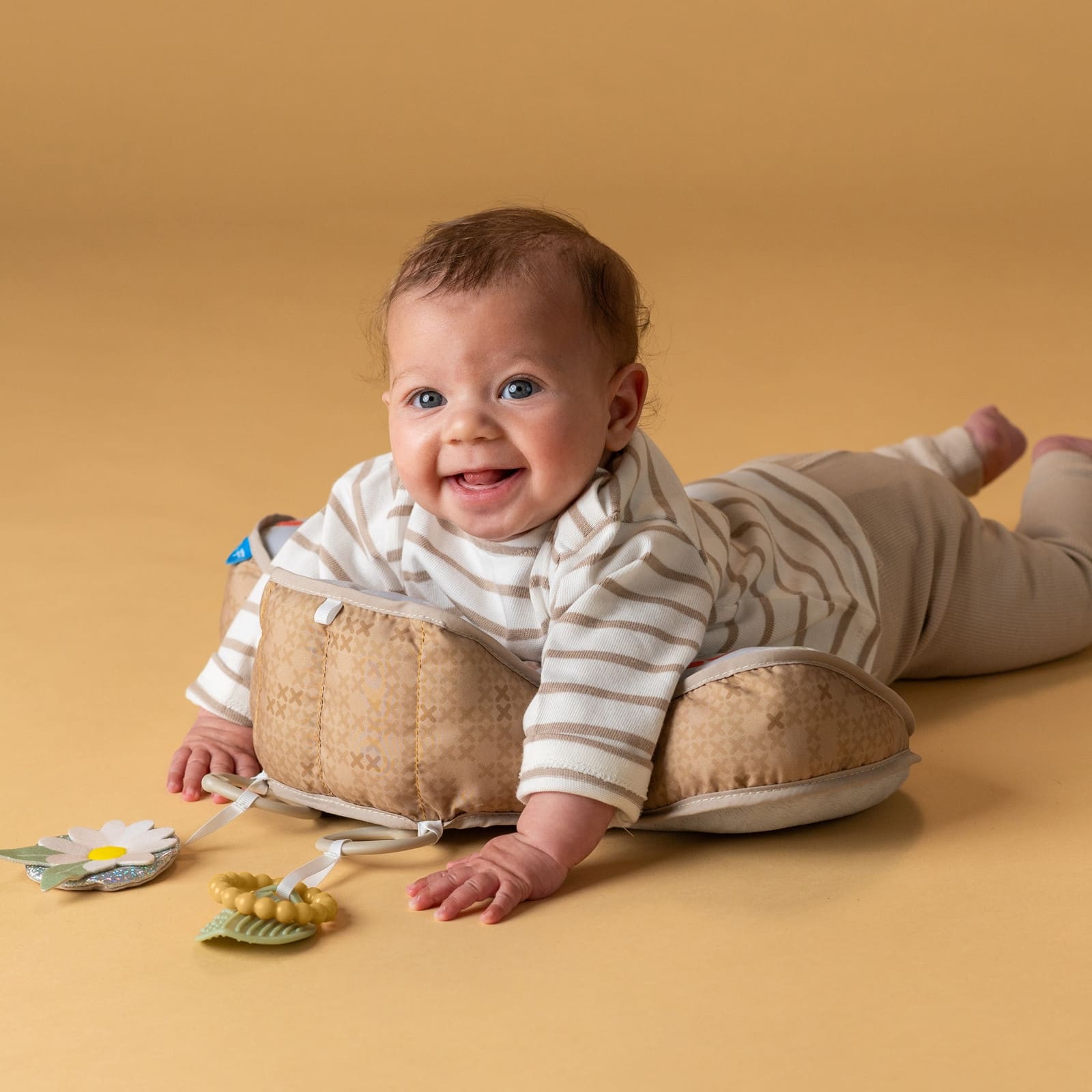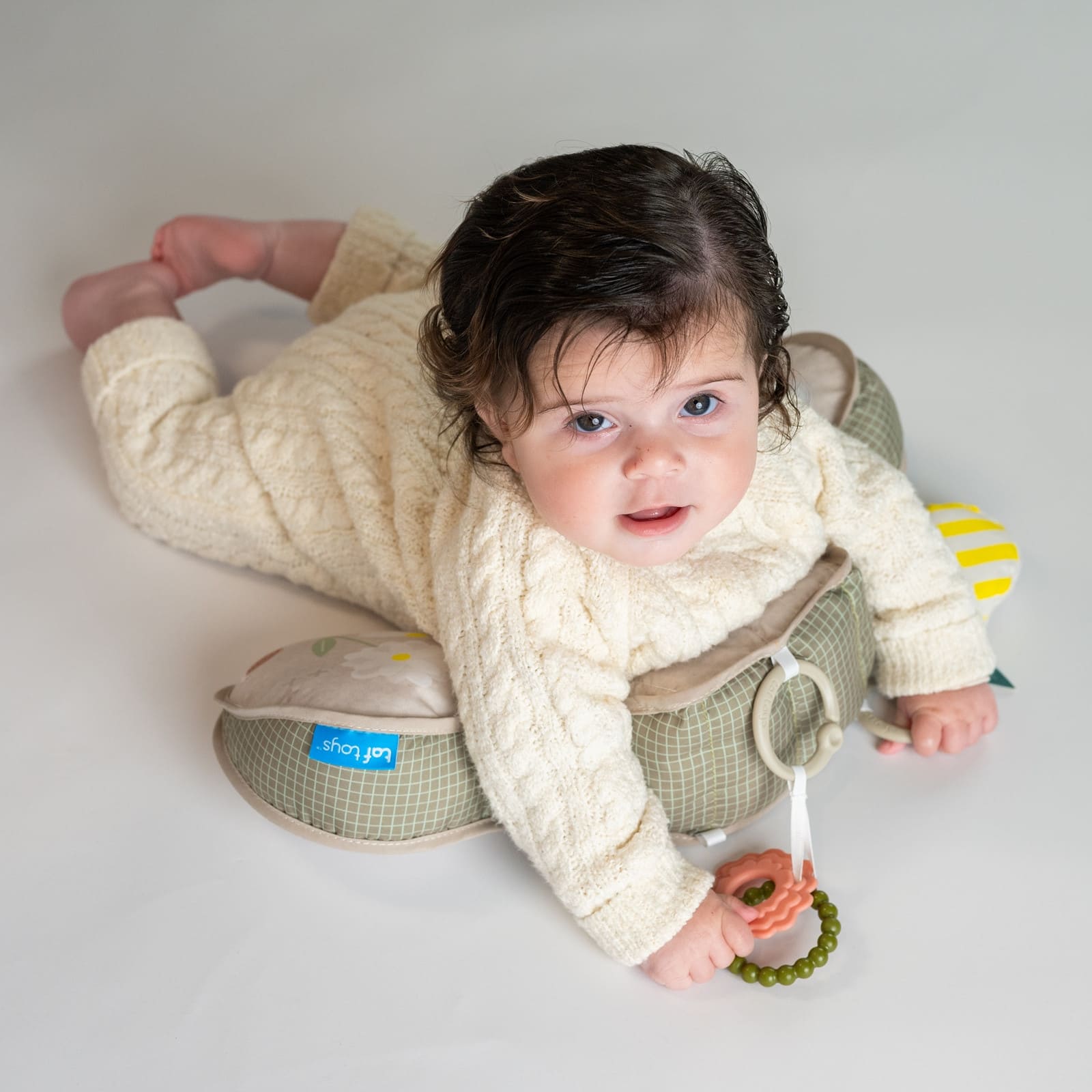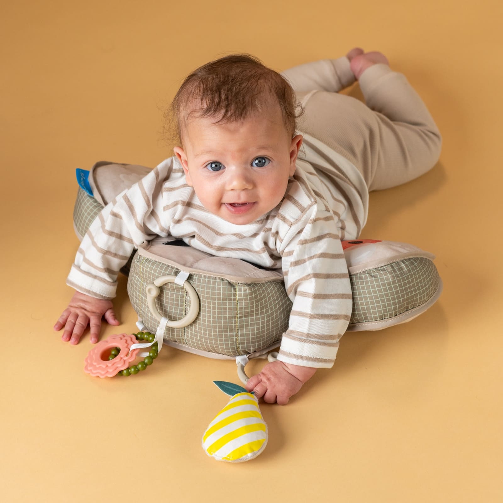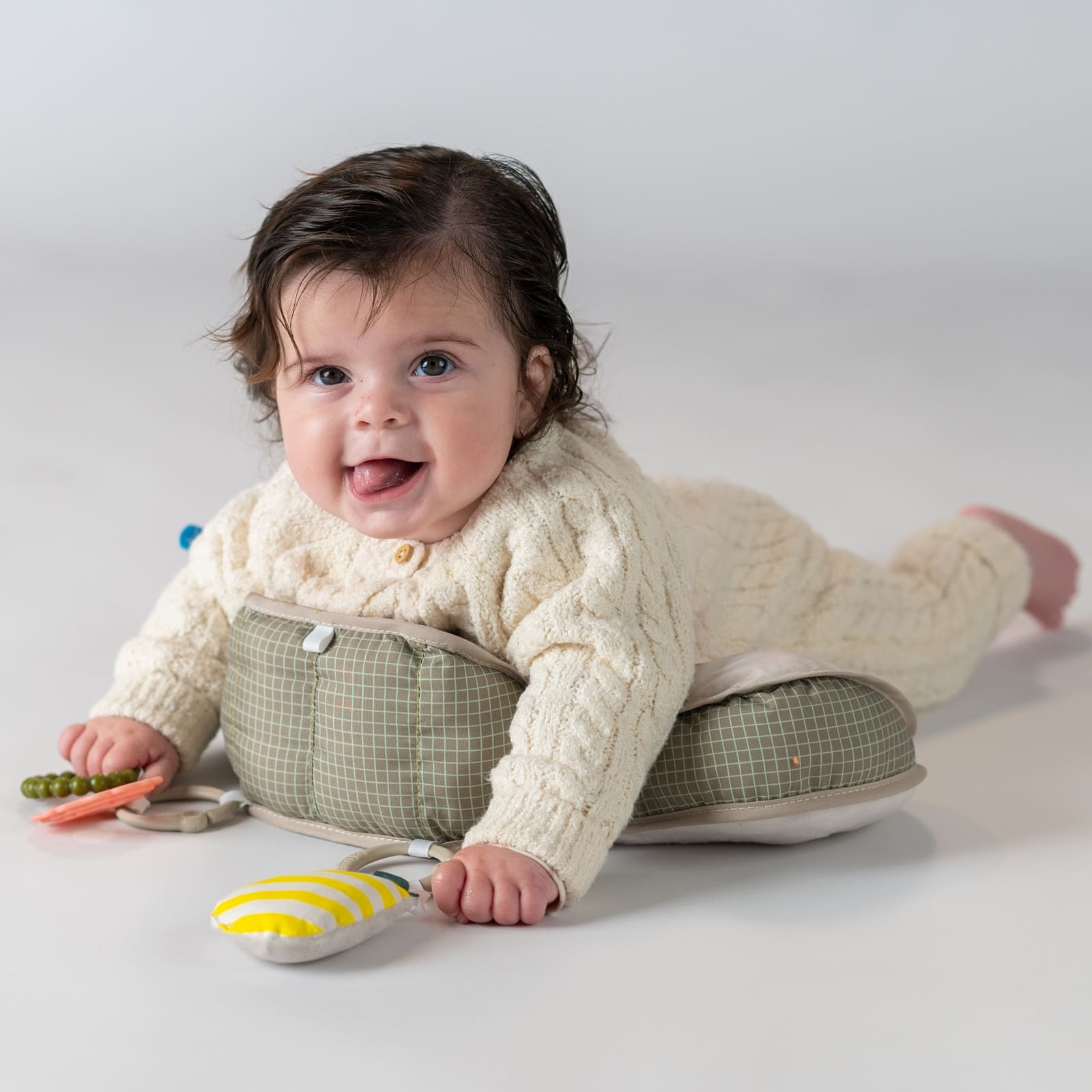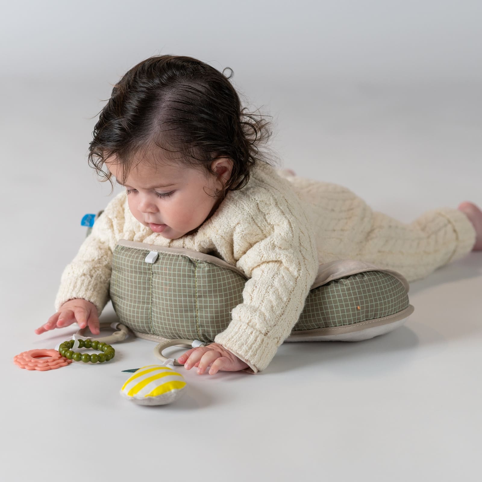 Particulièrement important est la conception réfléchie du coussin, équipé d'une petite cale qui soulage doucement le ventre des bébés tout en stimulant la curiosité de l'enfant pour explorer activement son environnement. Ainsi, le temps passé sur le ventre devient une phase agréable et passionnante, accompagnée de manière ludique par l’enfant.