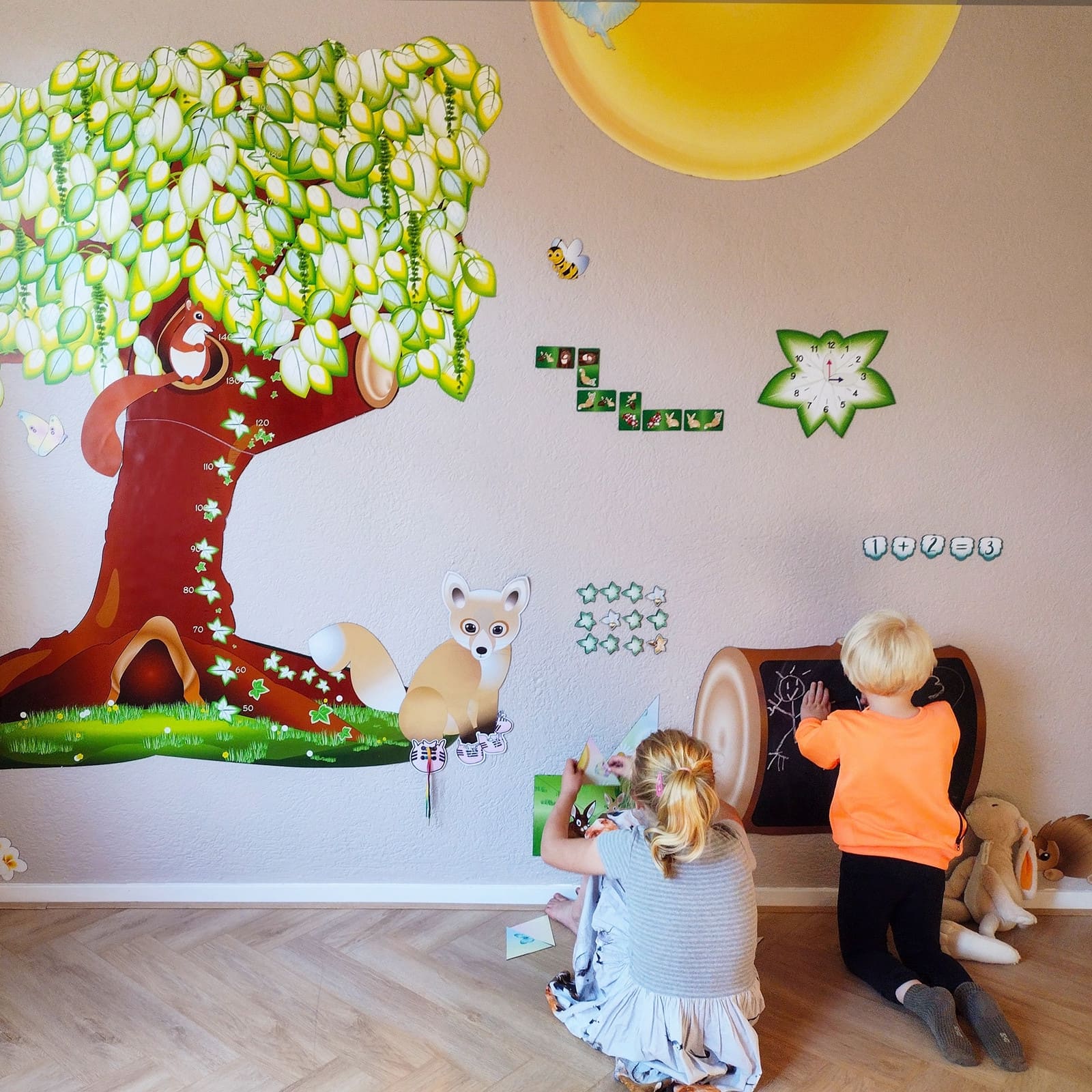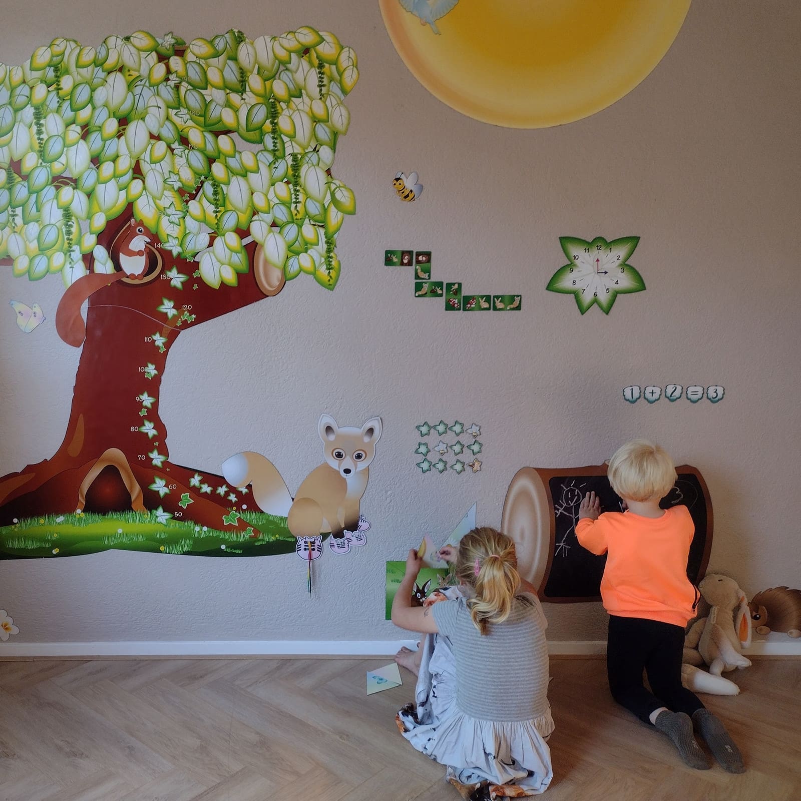 La préparation du mur est très simple : dans un premier temps, le mur est peint avec une peinture magnétique spéciale, puis une couche de finition de la couleur choisie peut être appliquée. Ensuite, il suffit d’accrocher le tronc d'arbre sur la surface magnétique. Cela crée une surface murale pratique, esthétiquement attrayante et personnalisable, invitant les enfants à laisser libre cours à leur imagination.