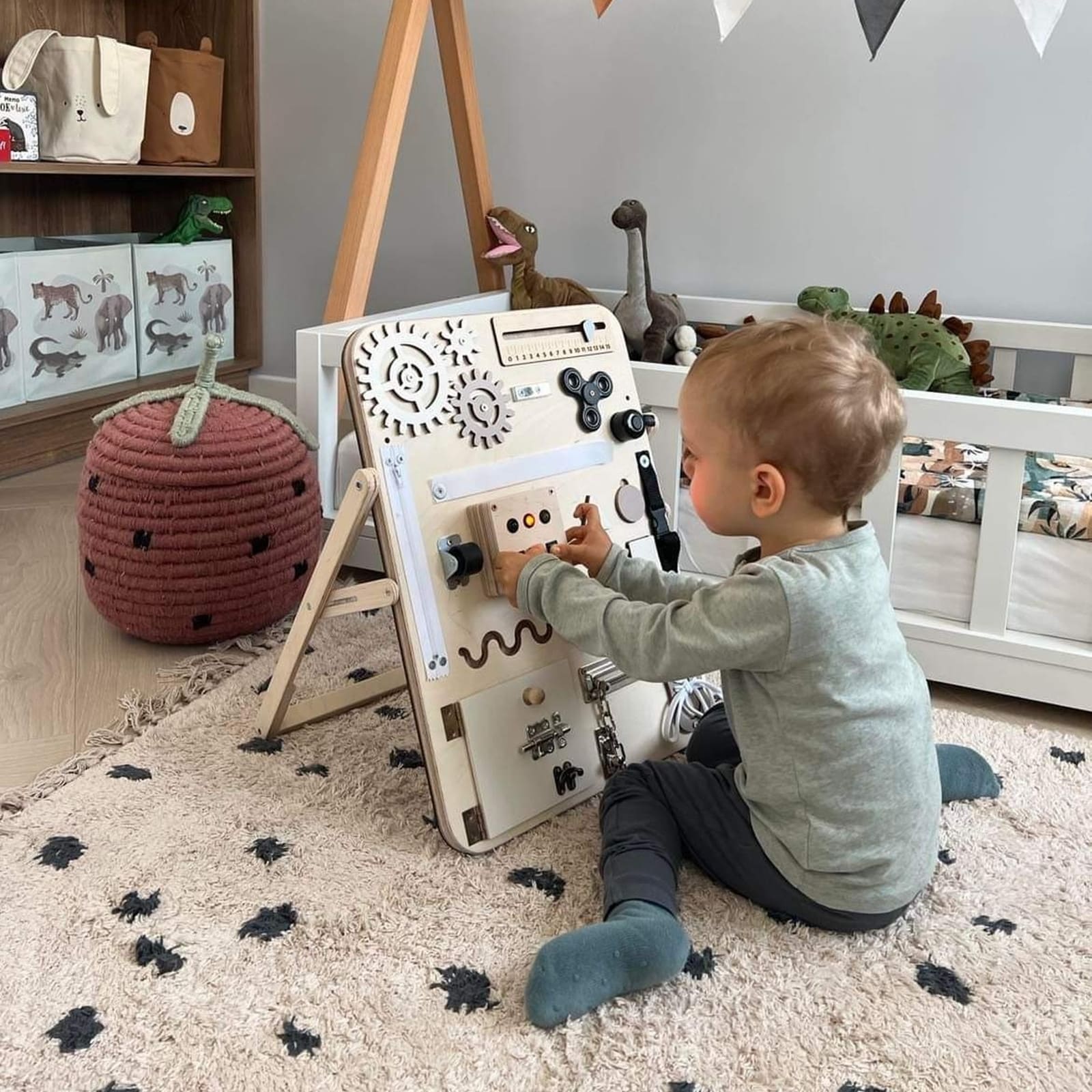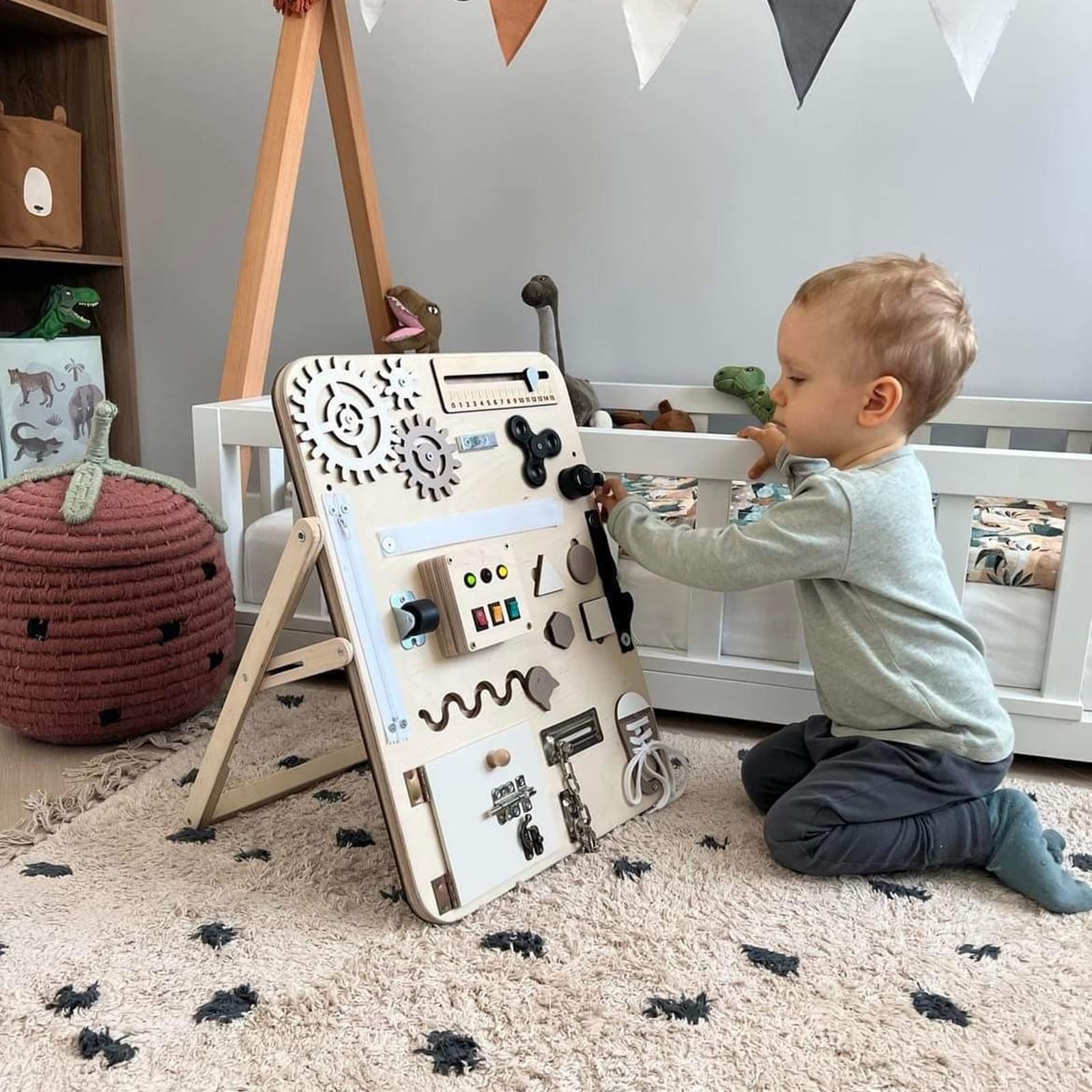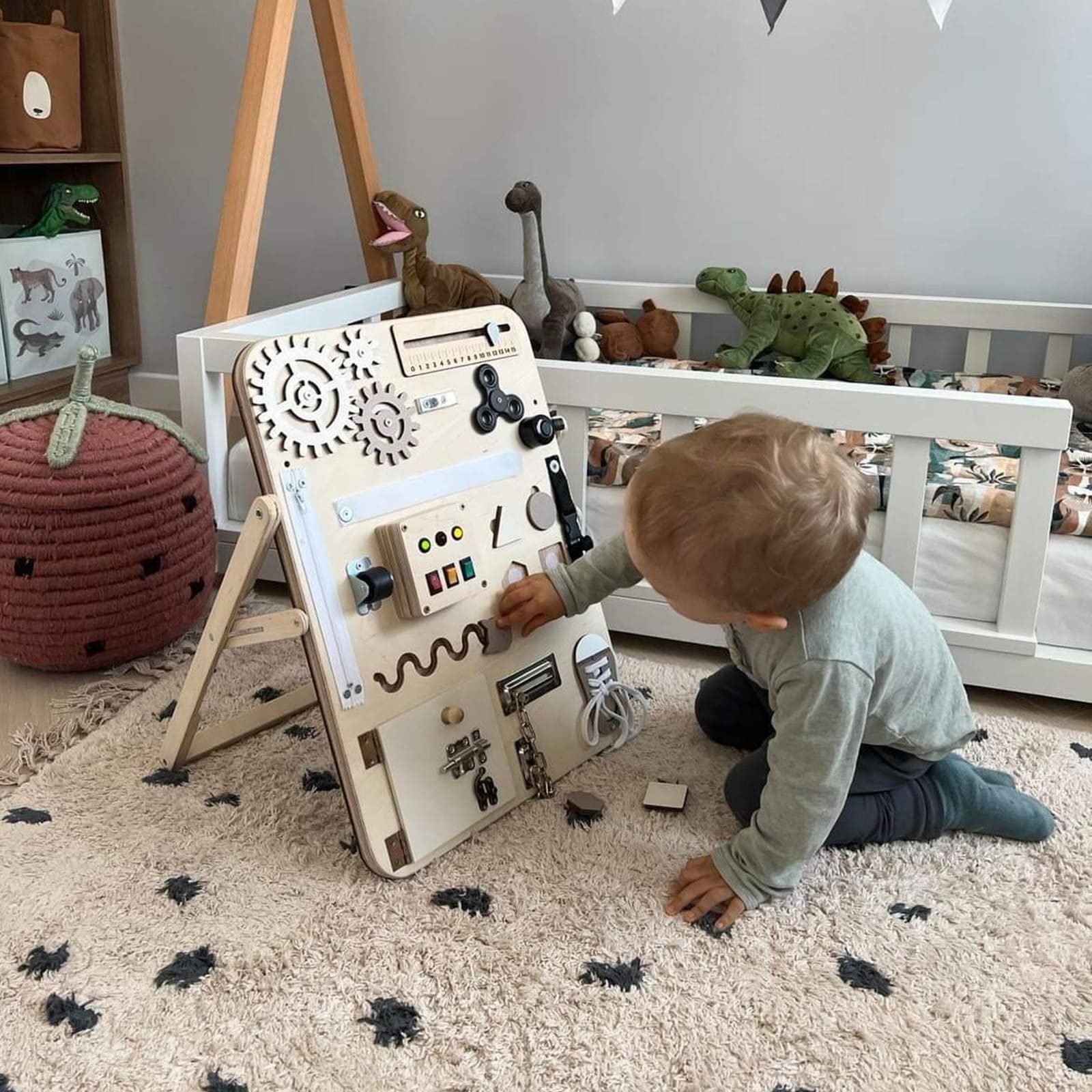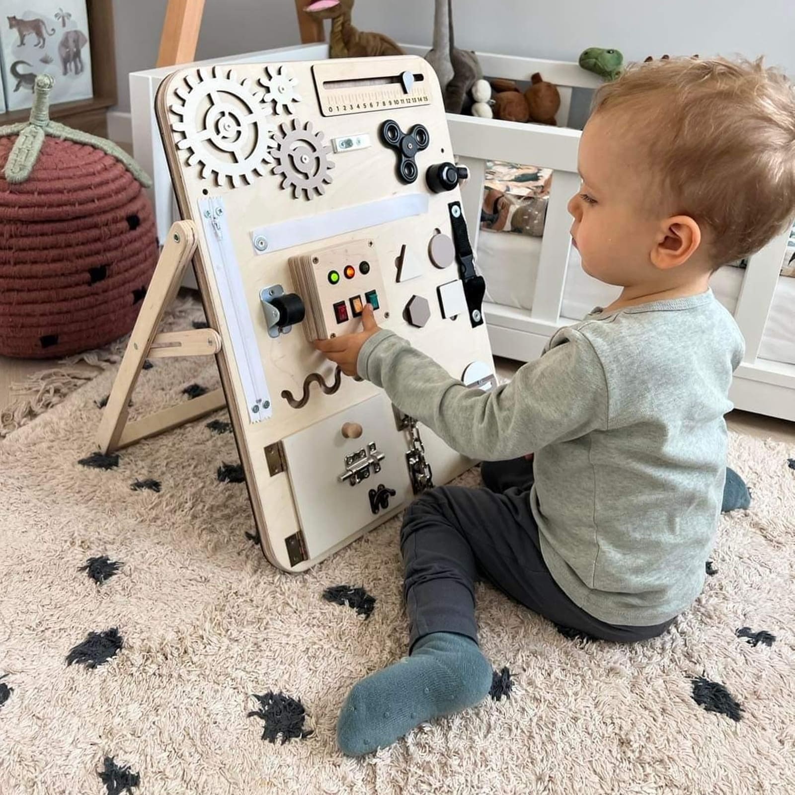 Le tableau d'activités séduit non seulement par sa fonctionnalité, mais aussi par le choix soigné des matériaux, durables et sûrs pour les enfants. Le design est structuré clairement, de sorte que l’attention de votre enfant n’est pas surchargée, mais encouragée à se concentrer sur les différentes possibilités de jeu.