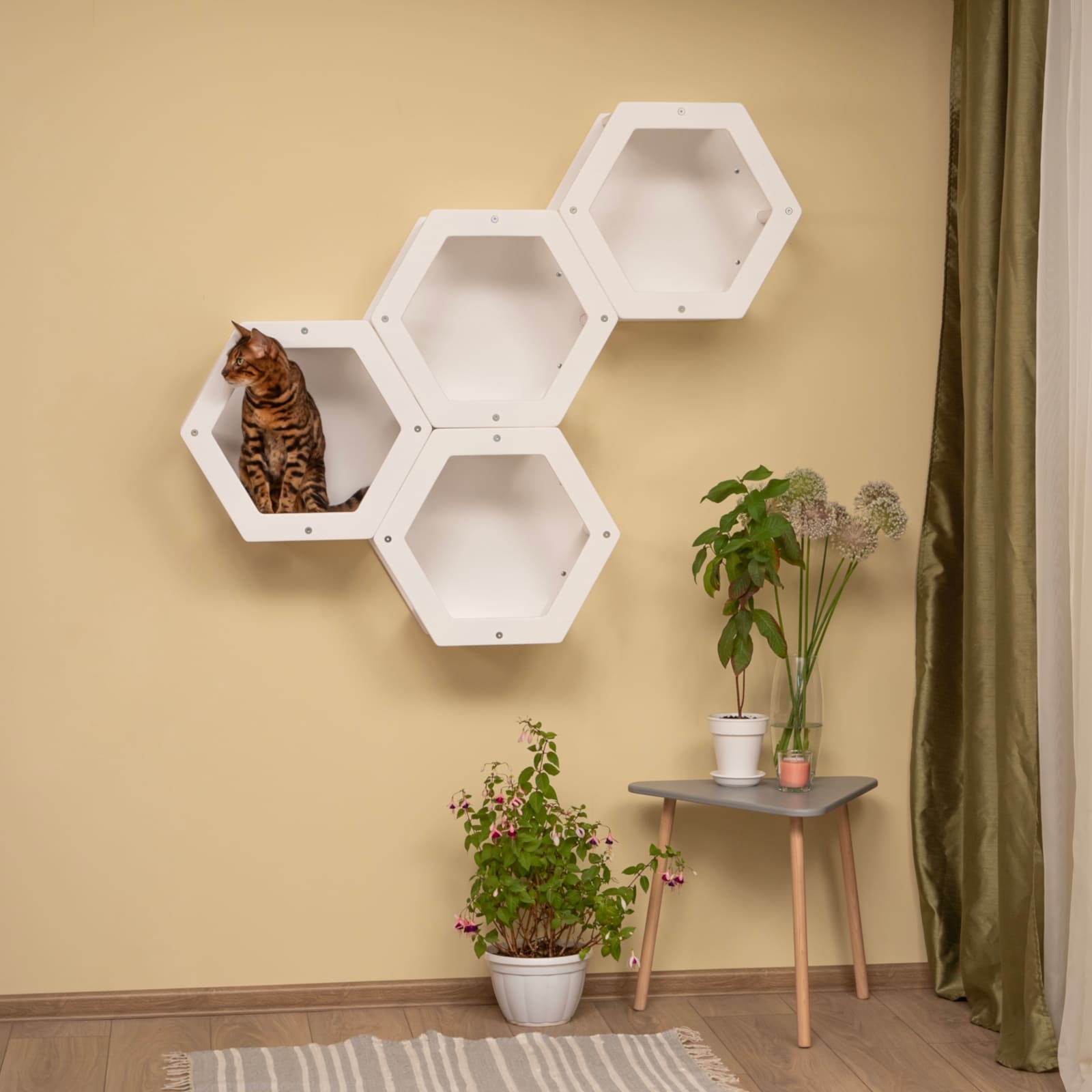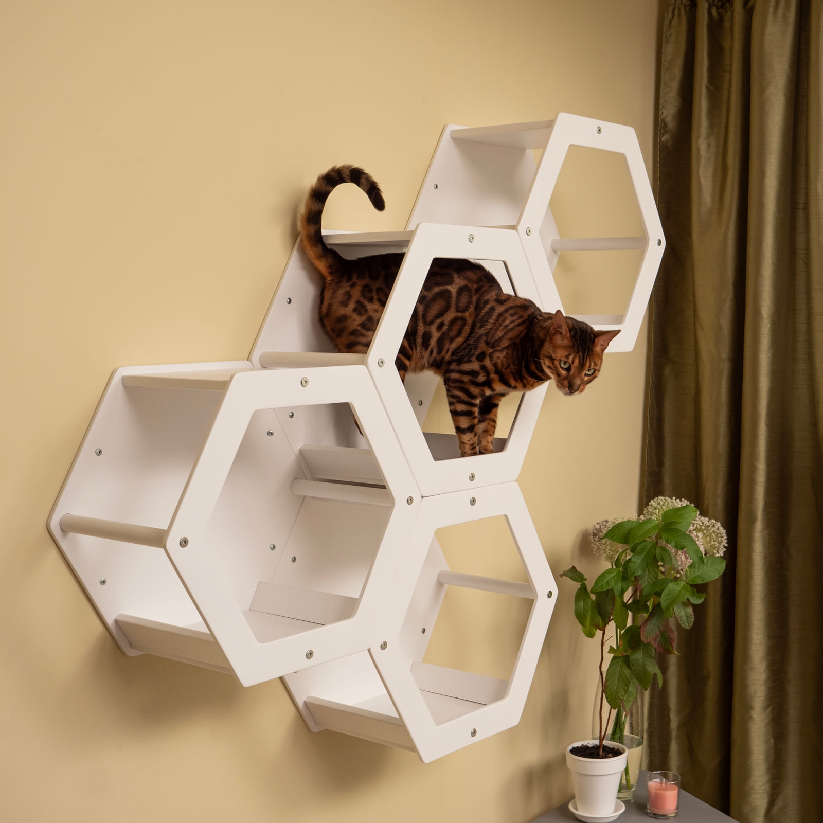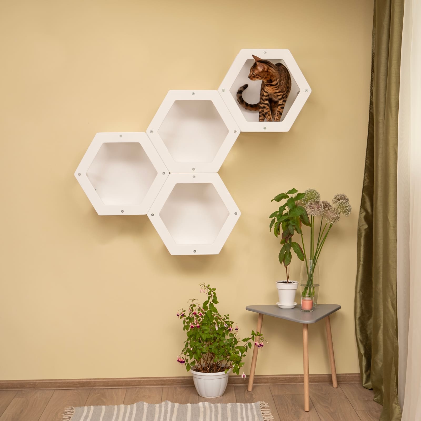 Les quatre compartiments hexagonaux offrent aux chats suffisamment d’espace pour grimper, jouer et se détendre. Les chats adorent observer leur environnement depuis des endroits en hauteur, et cet ensemble mural crée précisément ces lieux de retraite confortables. Avec différentes possibilités d’agencement, l’ensemble peut être adapté individuellement aux besoins de votre chat ainsi qu’à la pièce.