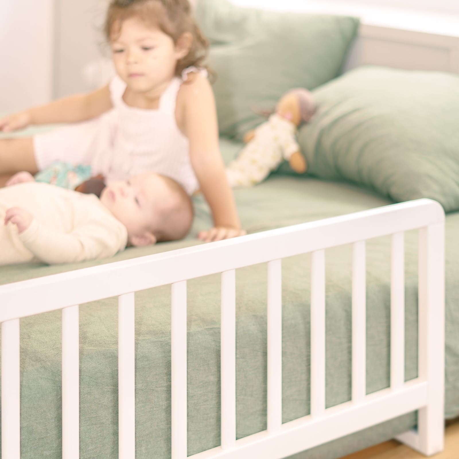 Mit dem Bettschutzgitter kannst du beruhigt schlafen, weil dein Kind sicher gebettet ist und nicht unbeabsichtigt vom Bett fällt. Gleichzeitig bleibt das Kind im vertrauten Umfeld bei euch, was viele Familien als beruhigend empfinden.