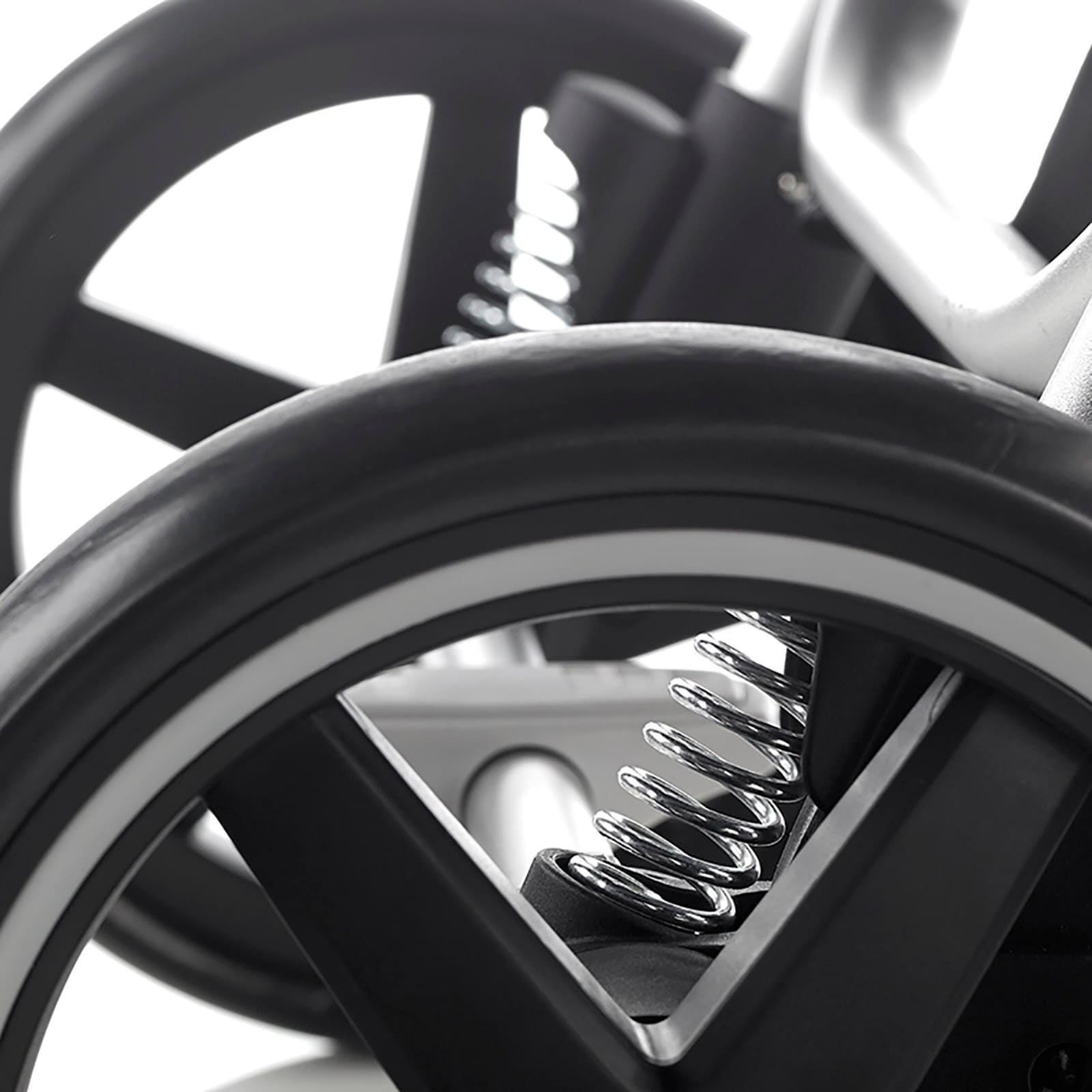 Vier gefederte Räder sorgen für eine ruhige und sanfte Fahrt, da Unebenheiten wirkungsvoll abgefedert werden. Das macht Spaziergänge auf städtischen und leicht unwegsamen Untergründen angenehm.