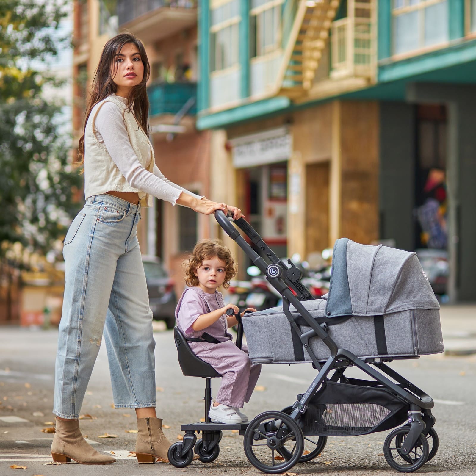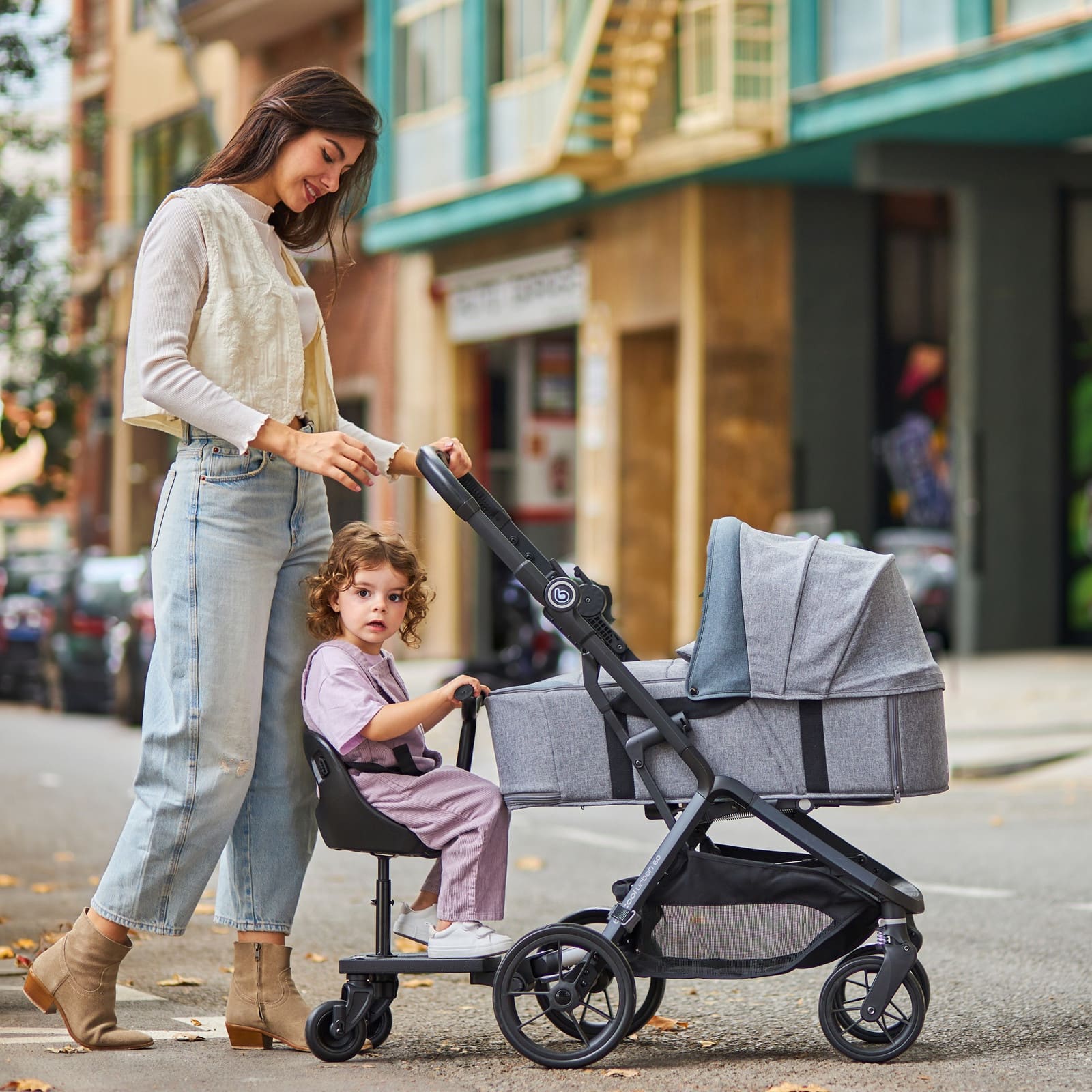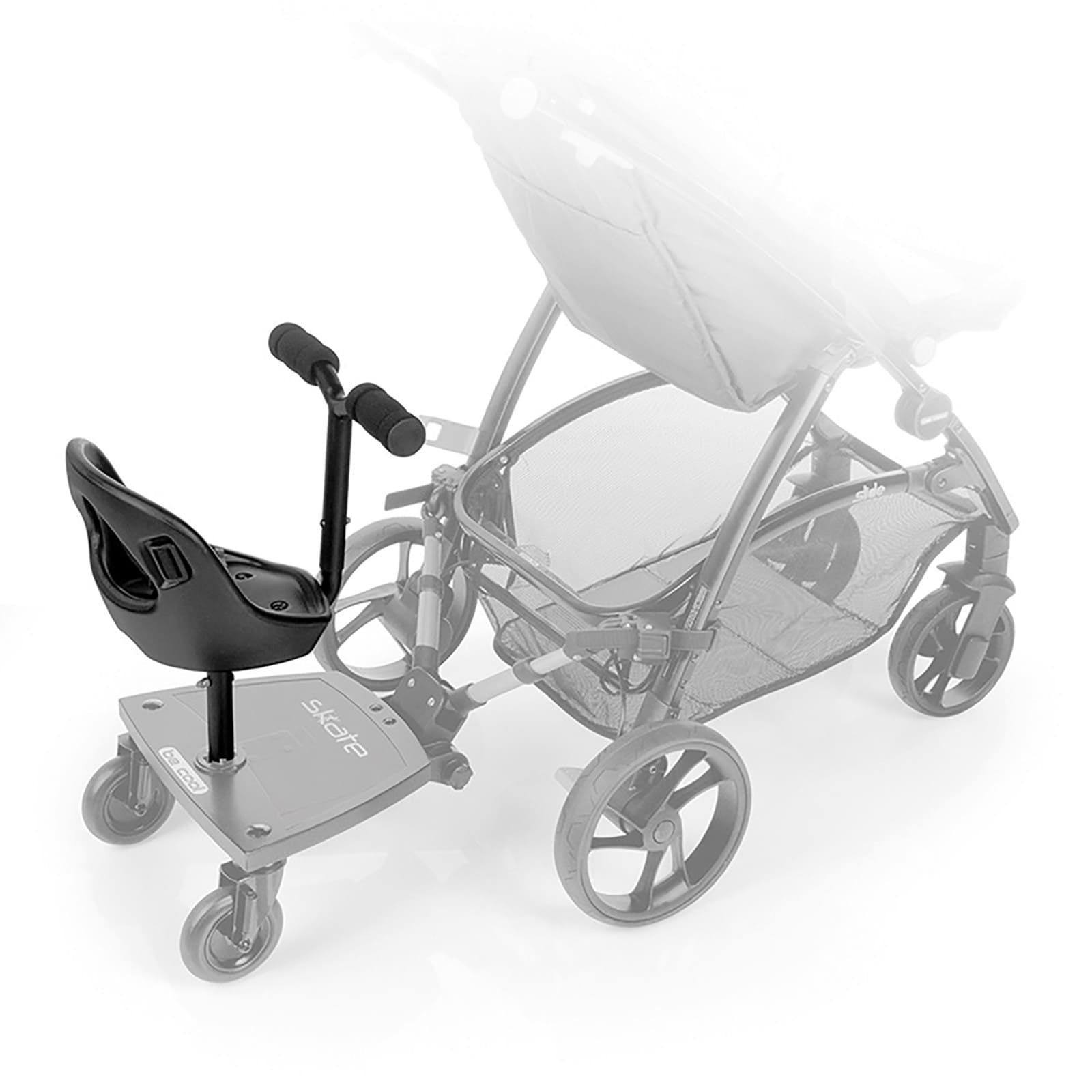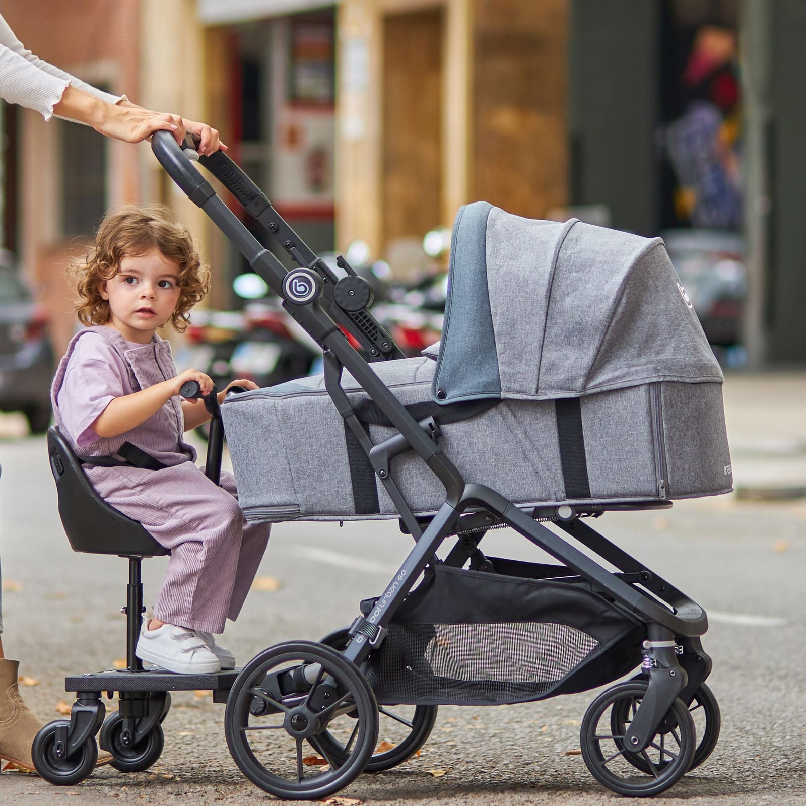Die Konstruktion ist stabil und bietet dem mitfahrenden Kind sicheren Halt, während du den Kinderwagen wie gewohnt führst. So bleibt das Handling praktisch und unkompliziert, auch wenns einmal hektisch wird.