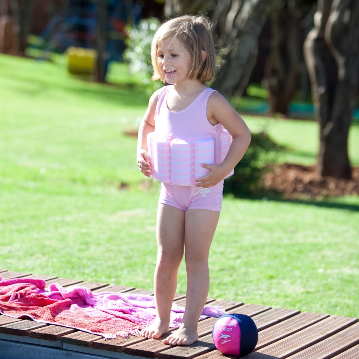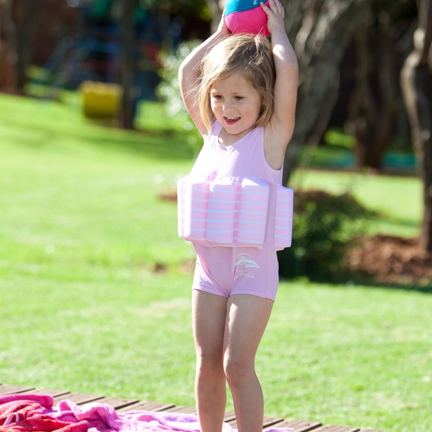 Der KONFIDENCE Badeanzug in Rosa mit dezenten Streifen wurde speziell für Kinder im Alter von 4–5 Jahren entwickelt. Statt herkömmlicher Armpuffs verfügt der Anzug über acht integrierte Schwimmblöcke, die dem Kind sicheren Auftrieb geben und gleichzeitig eine natürliche Wasserlage fördern.