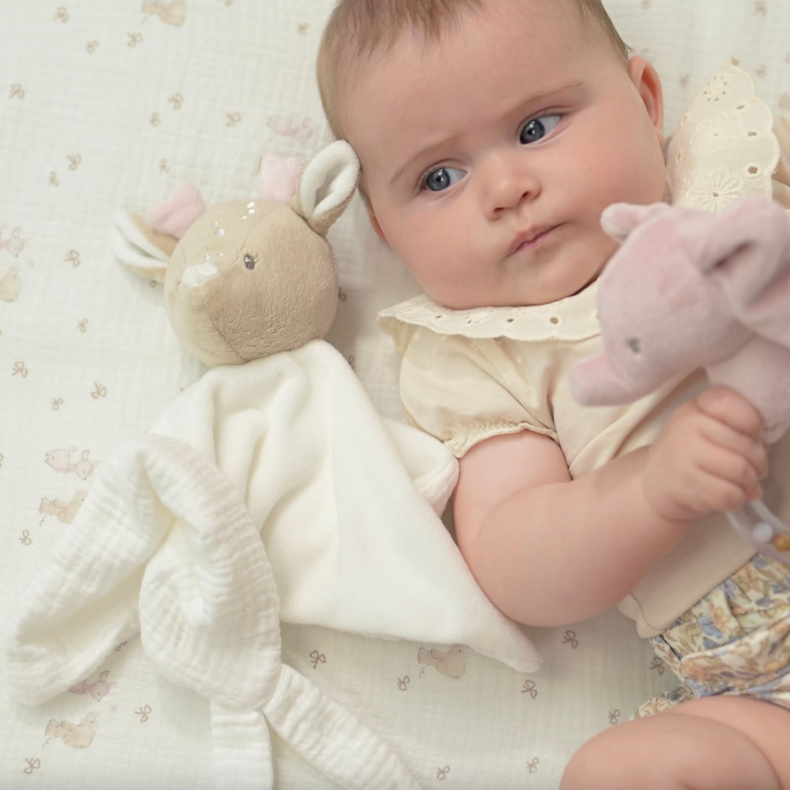 Dieses weiche Baby-Kuscheltuch wird von Geburt an der unzertrennliche Freund deines Kindes sein. Dank seiner kompakten Grösse und den vielen Greifmöglichkeiten ist es ideal für kleine Hände zum Greifen, Kuscheln und überallhin mitnehmen. Das Kuscheltuch bringt Ruhe und Geborgenheit, auch für Neugeborene und Frühgeborene. Ausserdem hat das Kuscheltuch eine praktische Schlaufe, an der man eine Schnullerkette befestigen kann, damit der Schnuller immer in Reichweite ist. Ein liebenswertes Doudou, das in schwierigen Momenten Trost spendet und ein wunderbares Babygeschenk für jeden Anlass ist.